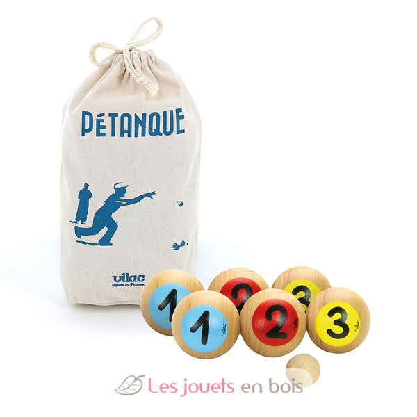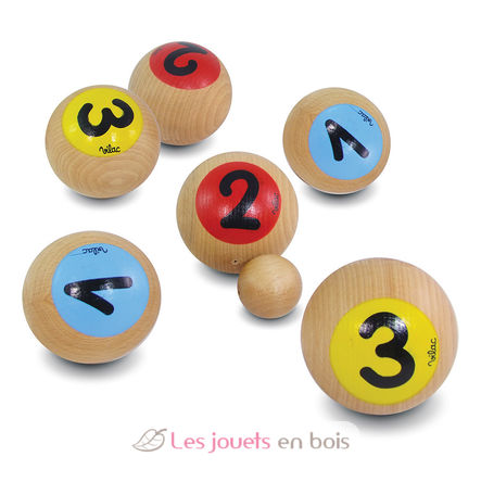This wooden petanque game is composed of 3 pairs of wooden numbered balls and 1 piglet. Comes with a storage bag.