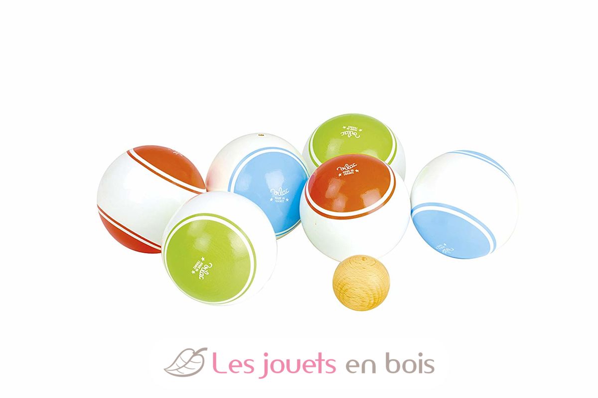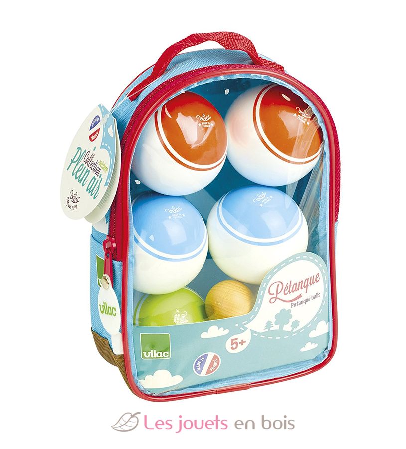 Basket with 6 petanque balls and wooden vintage jack. Kids will do as adults and play bocce. A wooden toy made by Vilac ref 4061