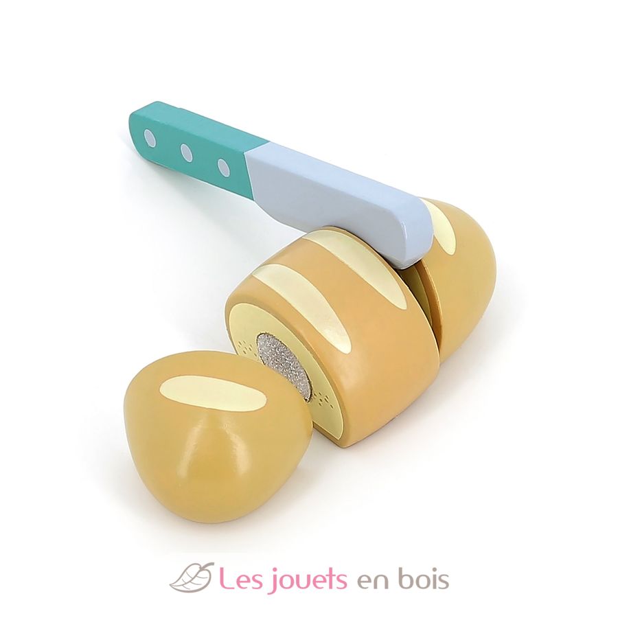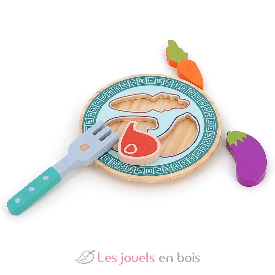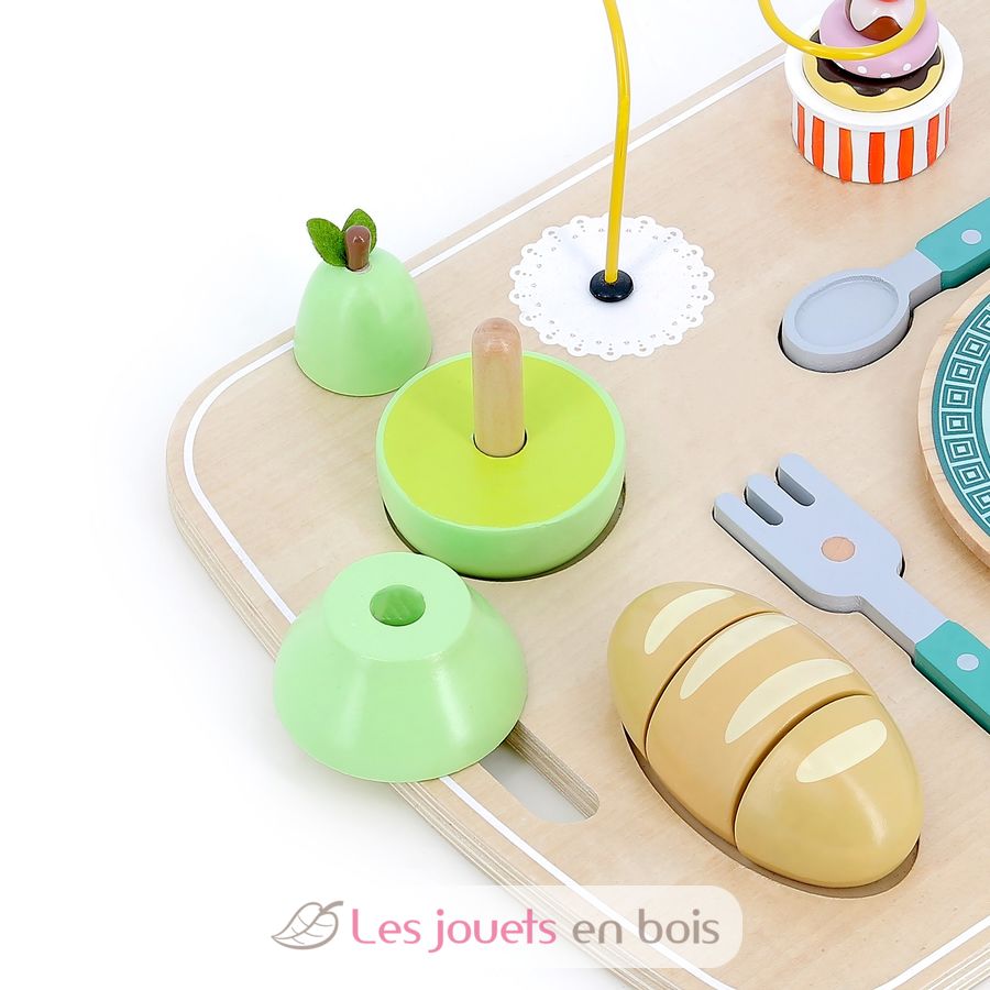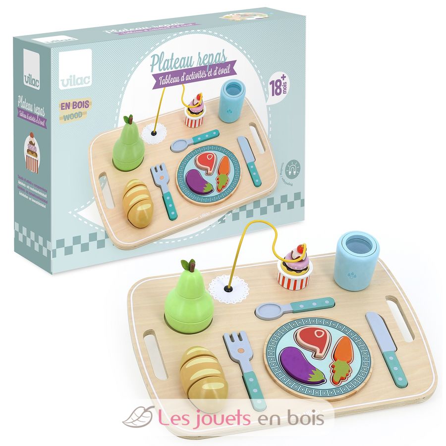 It's time to eat! This lovely multi-activity wooden meal tray has everything you need: a maraca drink, bread to scratch, meat and vegetables to nest, a stackable pear to eat, and a magnetic fork to grab the food.