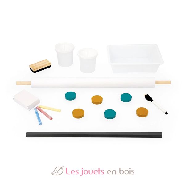 With this beautiful toy, you'll find: 6 round colored magnets, 10 colored chalks (white, yellow, green, blue, red and orange), 1 black dry-erase marker, 1 roll of paper, 1 chalkboard brush and 3 plastic storage bins. Thanks to all these accessories and the board's two sides, several children can write and draw at the same time! It's ideal for developing their imagination and creative expression.