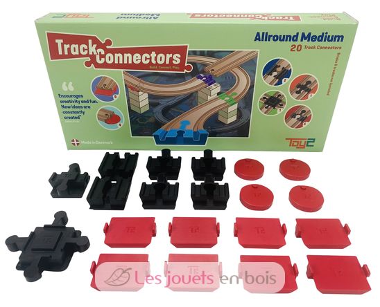 The Allround Medium contains 20 Track Connectors in plastic to connect your bricks and wooden train tracks : 4 basis connectors, 1 double-tab connector, 2 double-blank connectors, 4 anchor connectors, 8 straight connectors and 1 intersection connector.