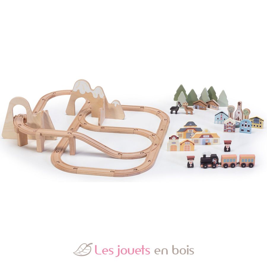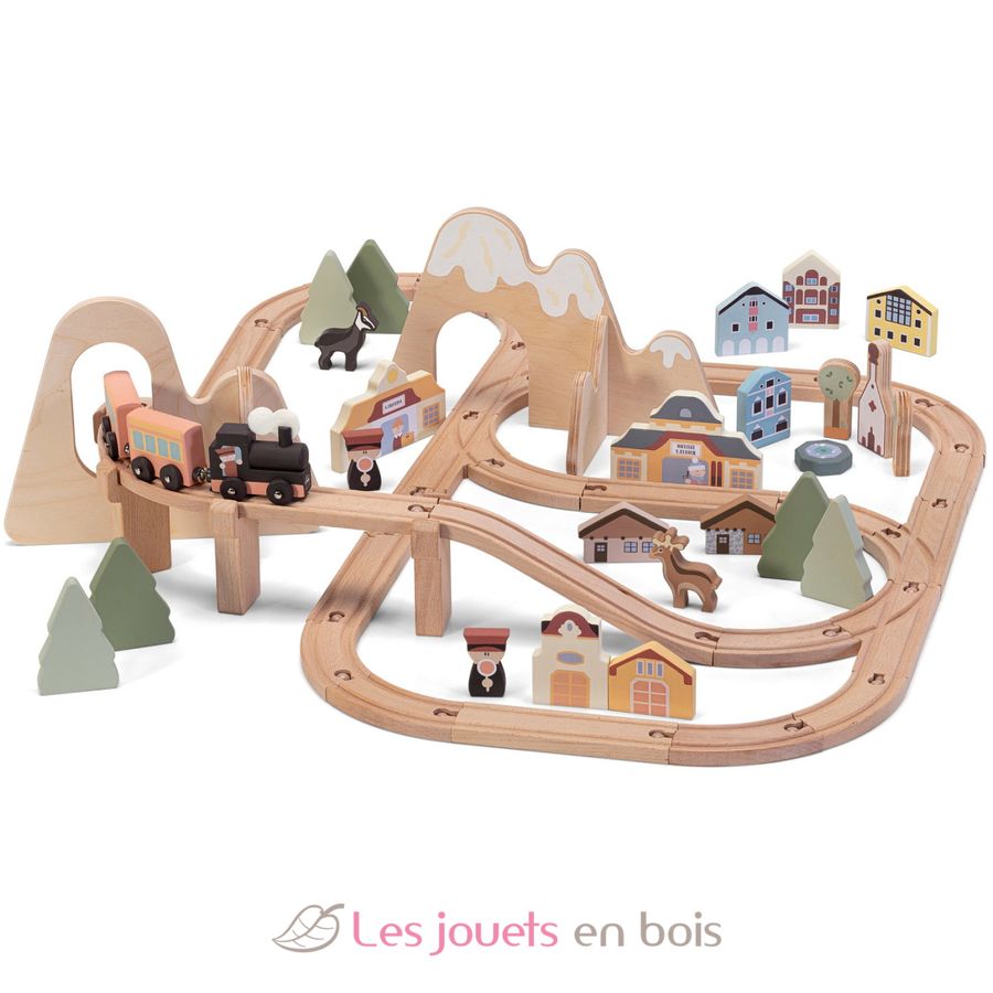 This train set, which crosses mountains, forests, and cities, is inspired by some of the most famous train stations in Val Gardena (in the Dolomites), including the town of Ortisei, where Sevi wooden toys were born.