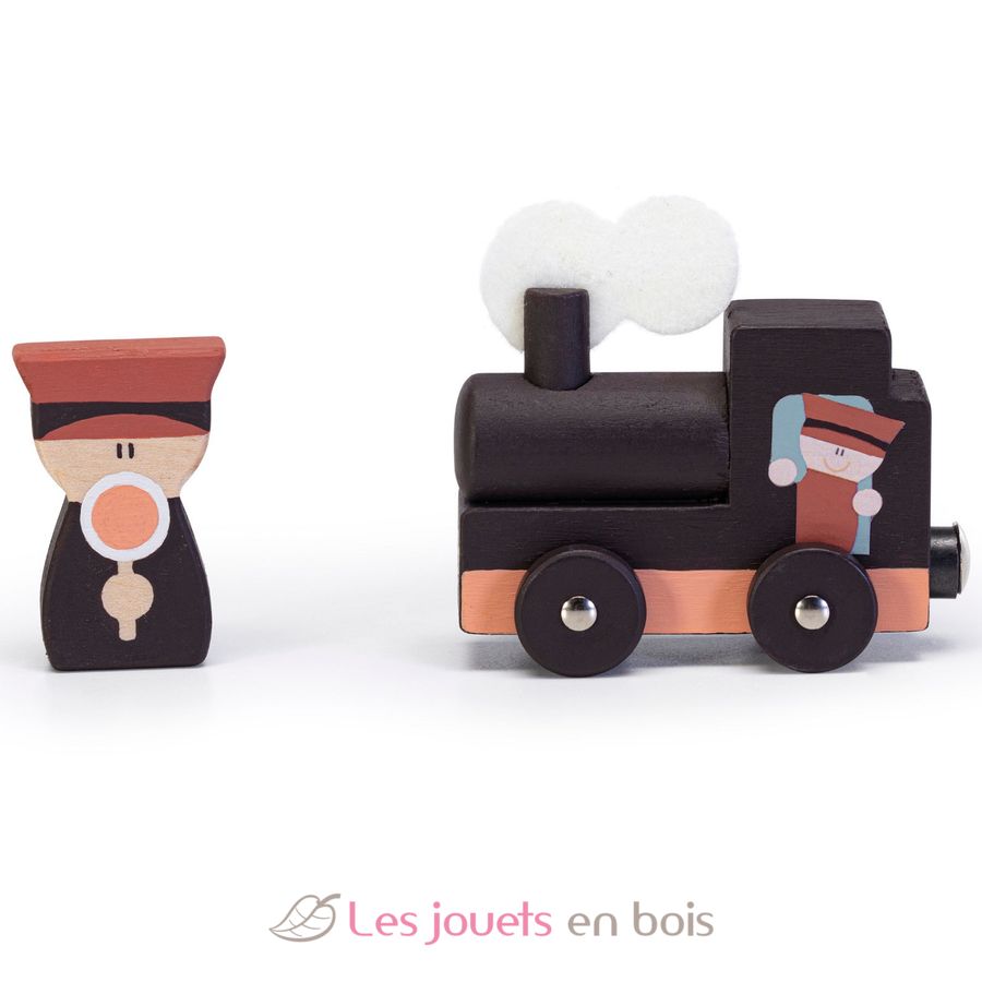 This wooden train set consists of 65 pieces, including 34 for the track and a locomotive pulling two wagons.