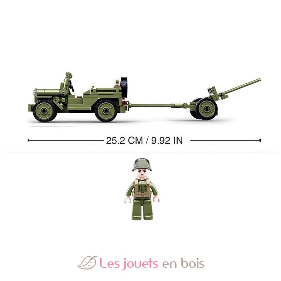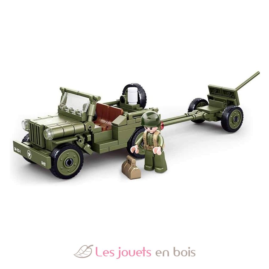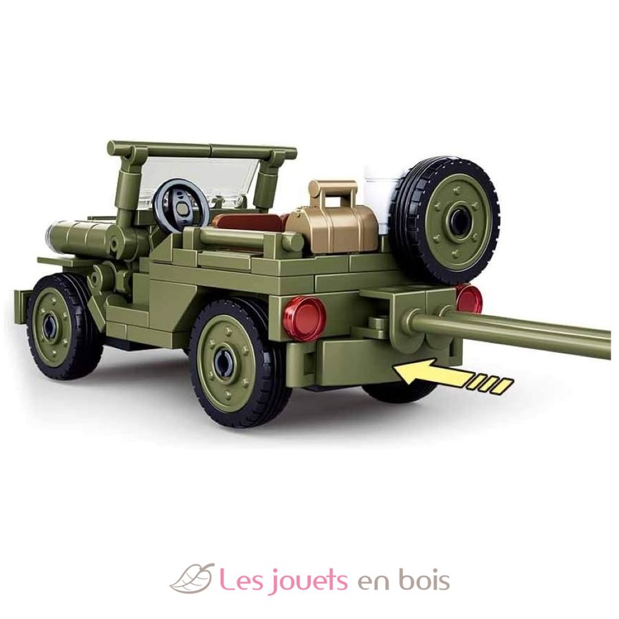 This Sluban construction kit contains 143 pieces and allows you to recreate a Willys Jeep used by the Allied forces during World War II, equipped with an anti-aircraft gun for defense against aerial threats.