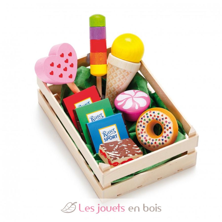 This crate contains the following candies from coloured laquered beech wood: 1 doughnut, 1 tartlet, 1 ice-cream cornet, yellow, 1 colorful ice lolly, 1 ice lolly, raspberry flavour, 1 Ritter Sport mini mix (3 pieces), 1 piece of Danube-wavy cake.