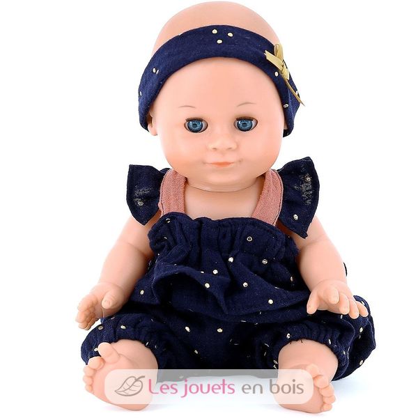 This doll is entirely made of soft perfumed vinyl, in the Petitcollin workshop located in Étain, France. This doll has blue sleeping eyes with eyelashes and chestnut painted hair. Her outfit consists of a pretty night blue double gauze jumpsuit with golden sequins and her matching headband. This jumpsuit closes behind the doll's neck with velcro to make it easier to dress and undress the doll. Her vinyl limbs allow for quick and easy dressing.
