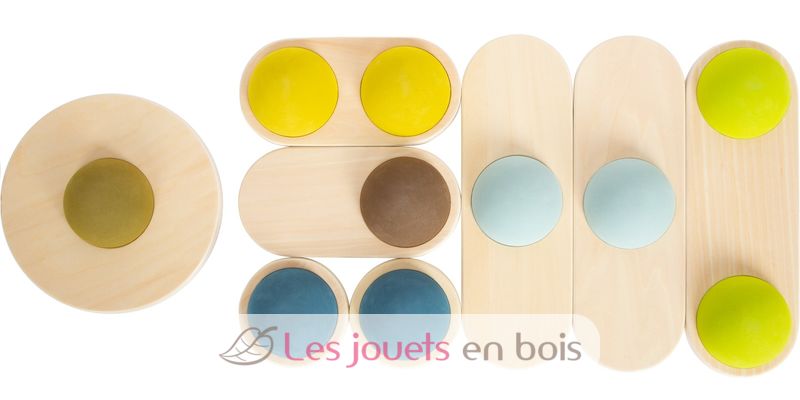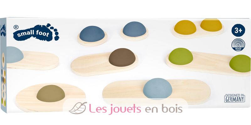 These balance stones made of wood that can be used on both sides not only train young adventurer's balance and encourage them to move about - they also train their coordination while being lots of fun! The half-sphere elements made of robust foam positioned differently under each balance stone present different challenges to children. When all of the stones are combined together, they form a creative balancing pathway with individually adjustable difficulty levels.