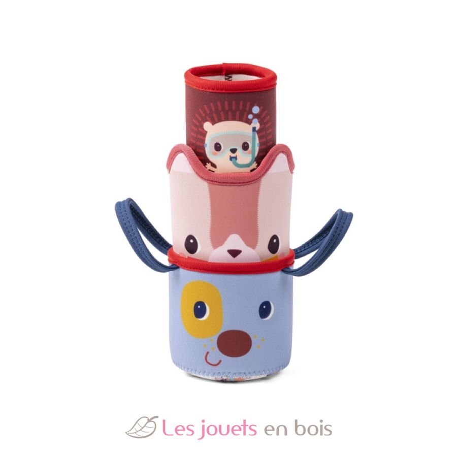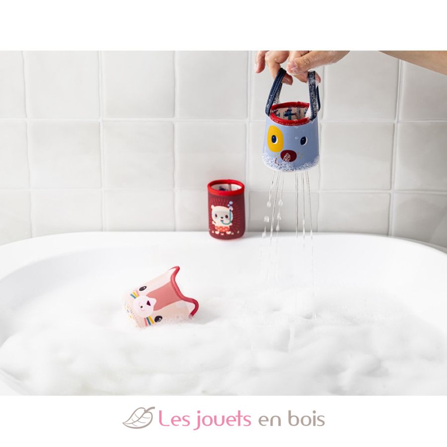 This watering game will continue to pique baby's curiosity and develop toddlers' motor skills! Your child will love fitting the cups together and discovering the different water jets. This practical set of bath buckets is made of neoprene and polyester: it dries quickly and easily. They can also be fitted together, for even easier storage. Whether for washing or having fun in the water on a hot day, this Lilliputiens water game promises long hours of fun!