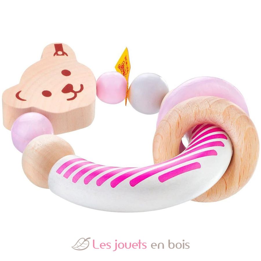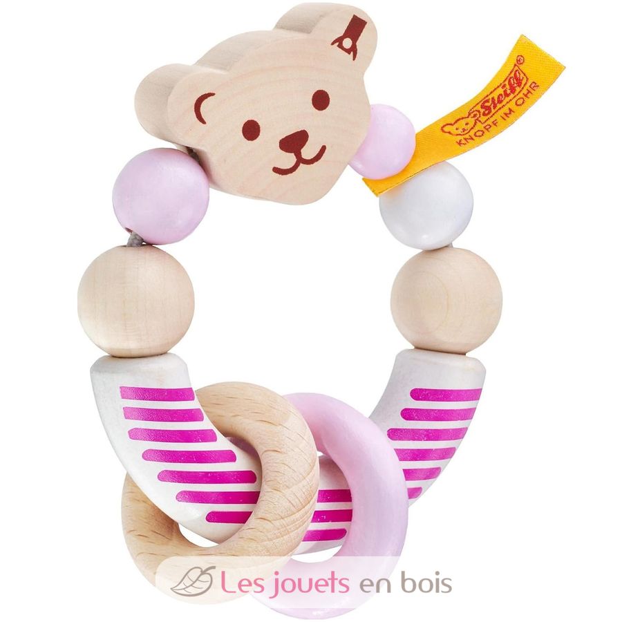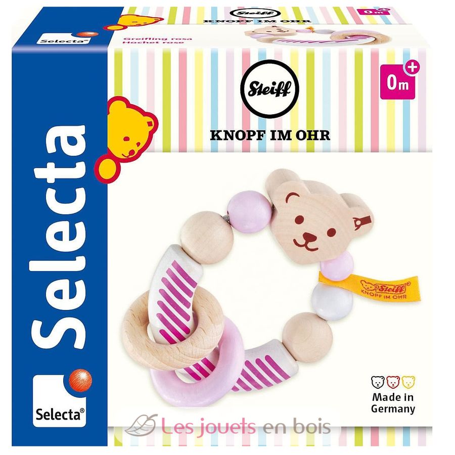 Bear Steiff rattle pink, a wooden rattle made in Germany by Selecta.