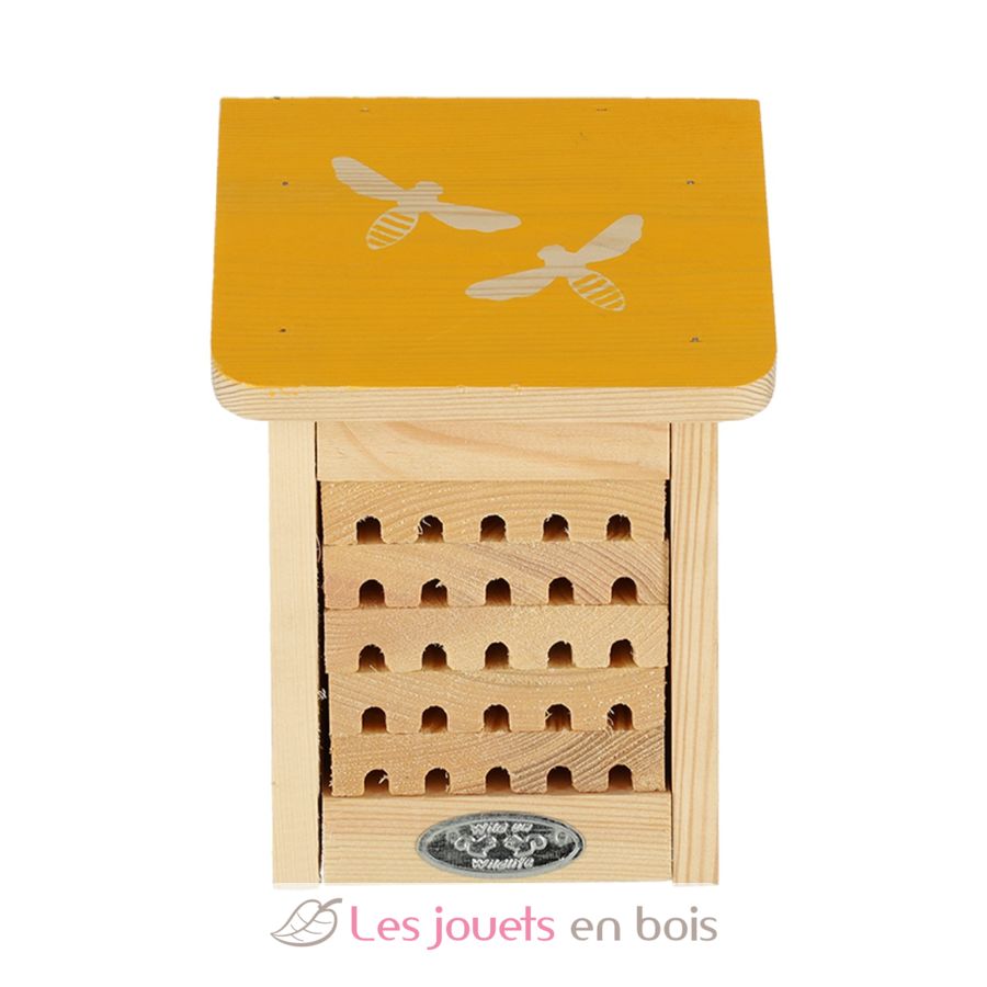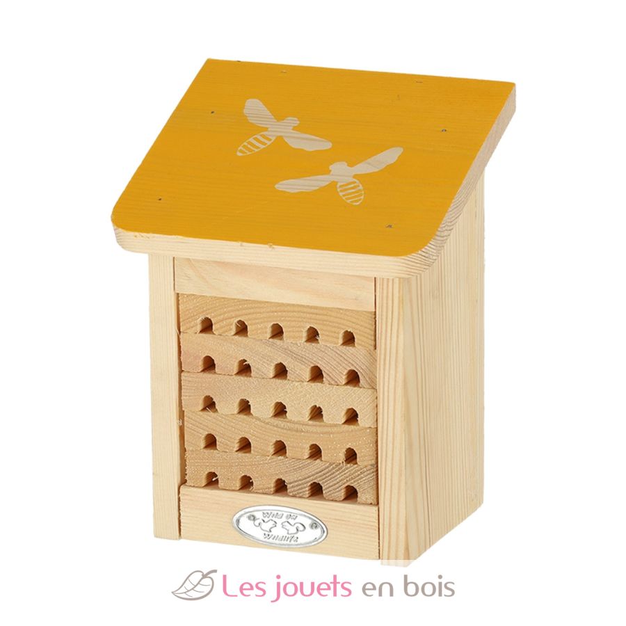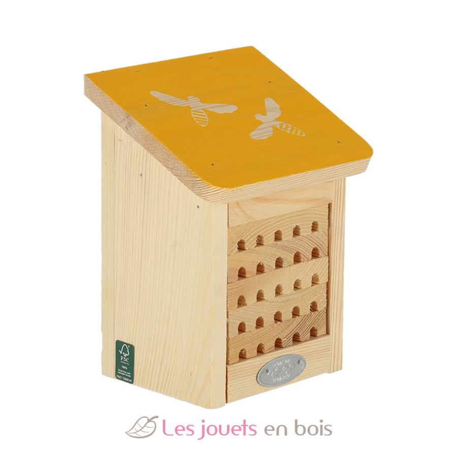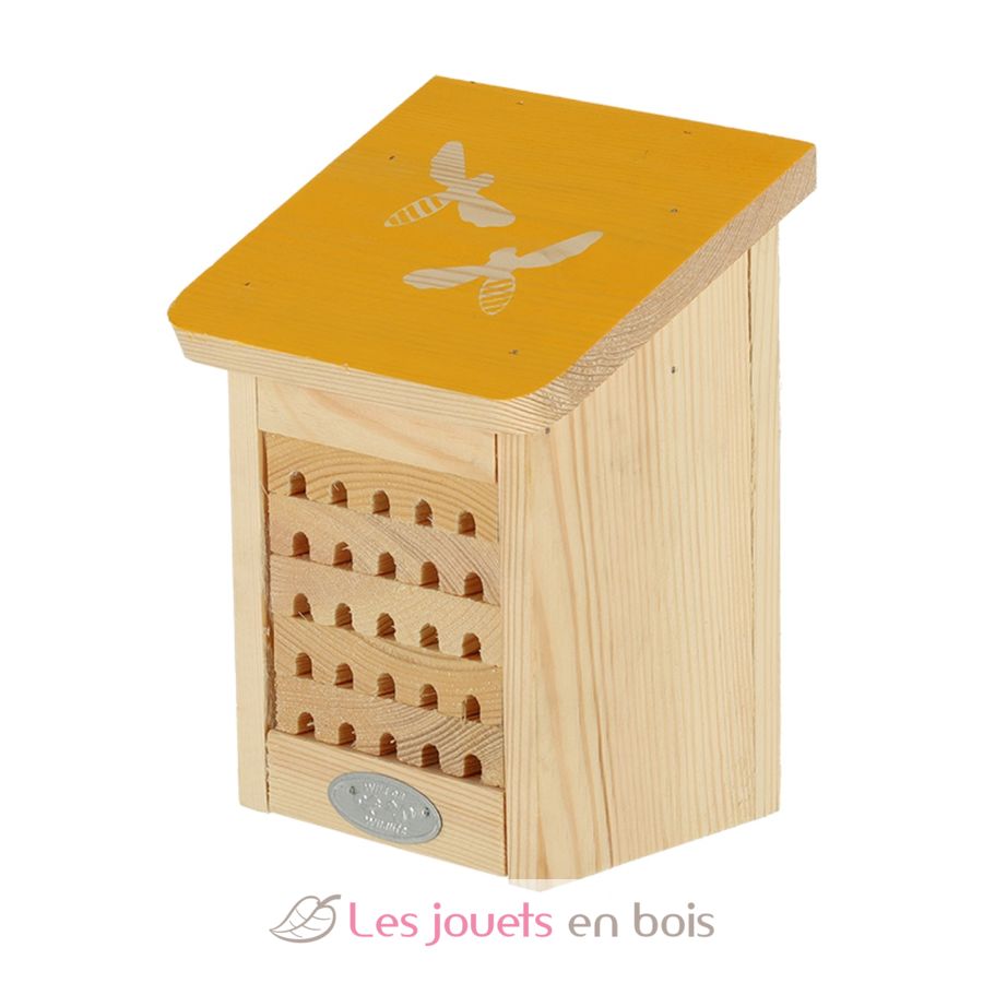 Bee house made from pinewood FSC certified, with cheerful coloured roof and a diapositive silhouette.