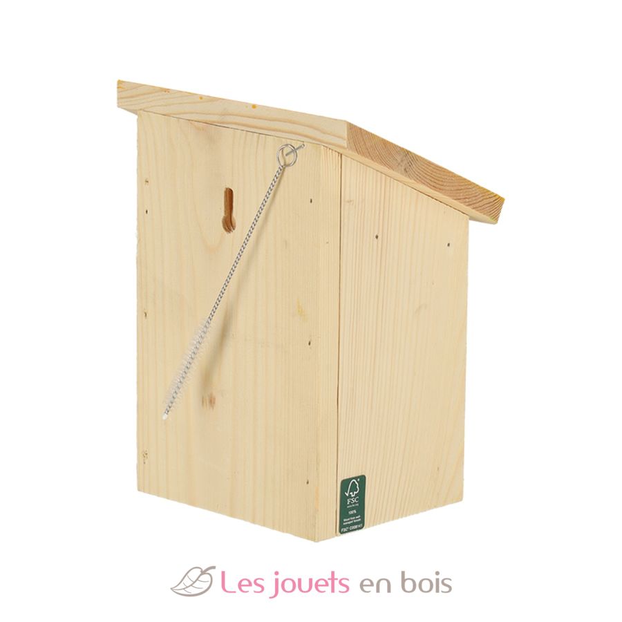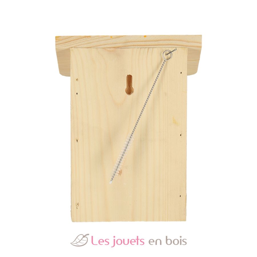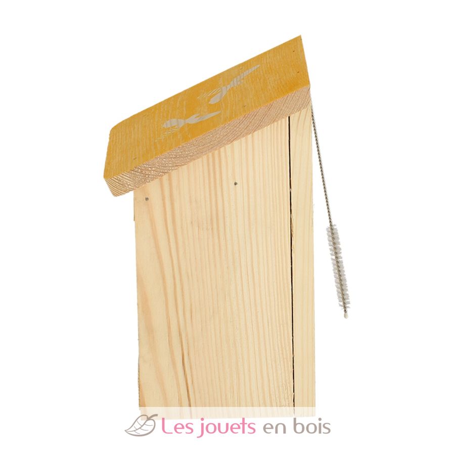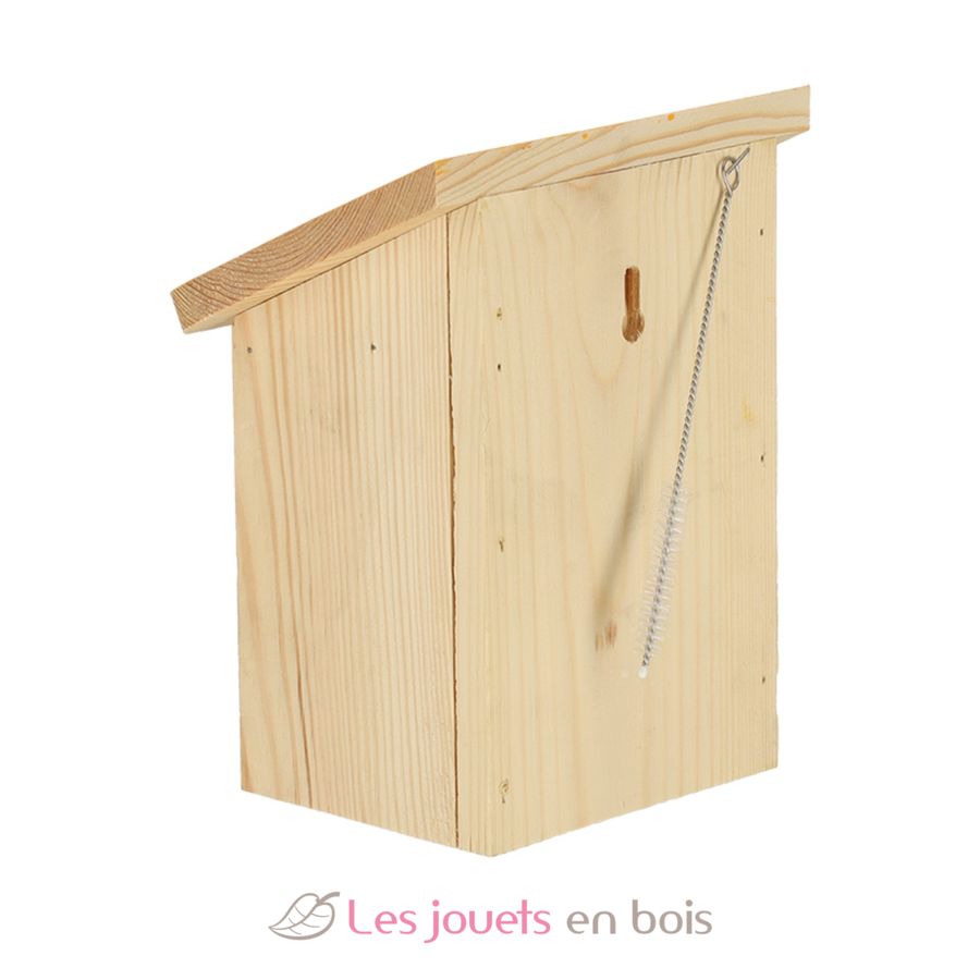 Bee house made from pinewood FSC certified, with cheerful coloured roof and a diapositive silhouette.