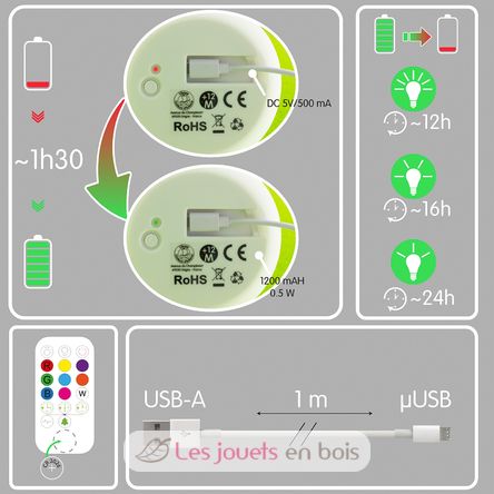 The pilot light operates on battery. This is recharged using the USB cable (supplied) by connecting to a USB device or a universal power charger (type mobile phone charger) .The remote control (battery included) allows access to additional functions, for example the timer function (15, 30 or 60 min).