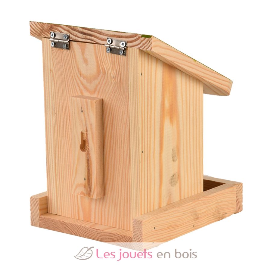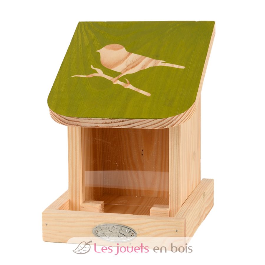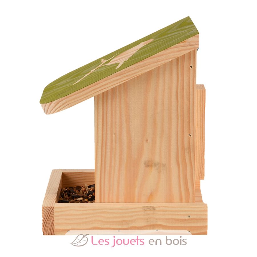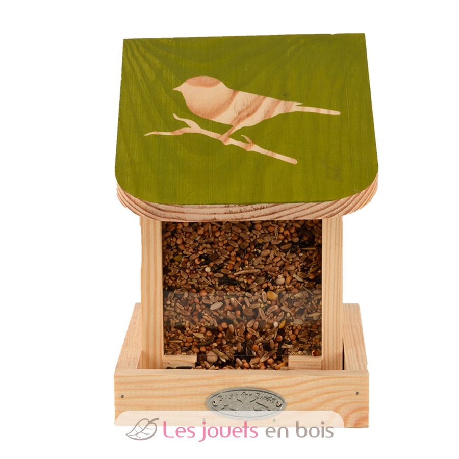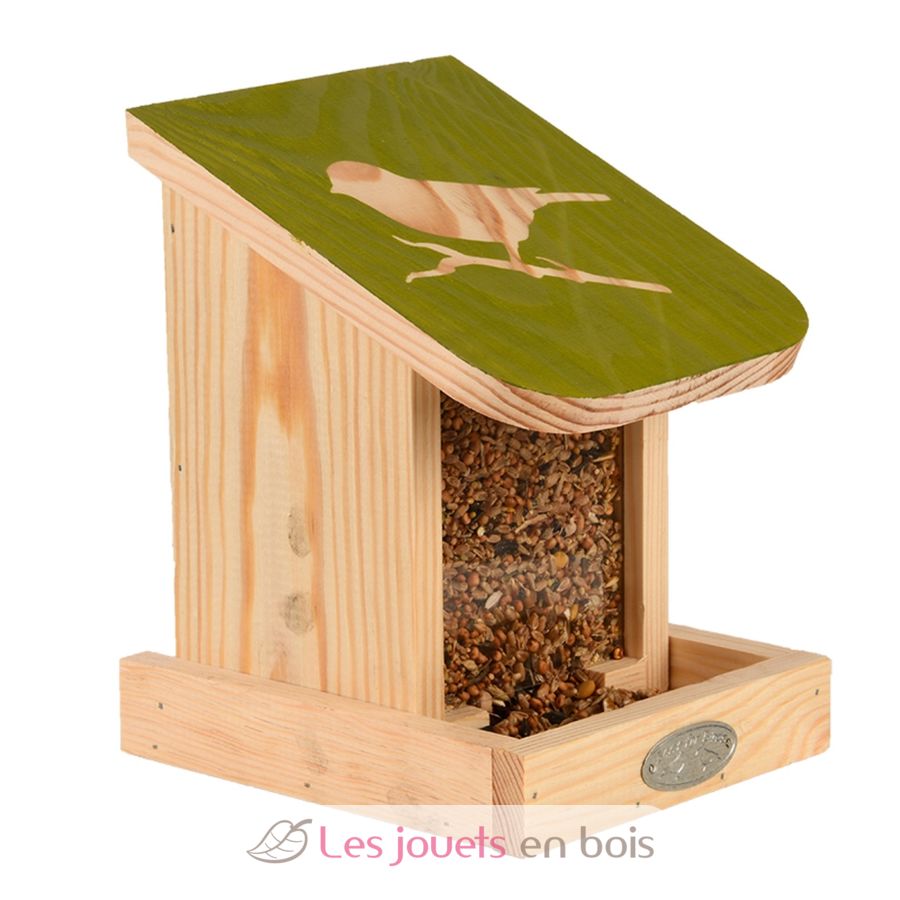 This bird feeder is a pretty pine wood silo feeder with a colorful roof featuring a bird silhouette.