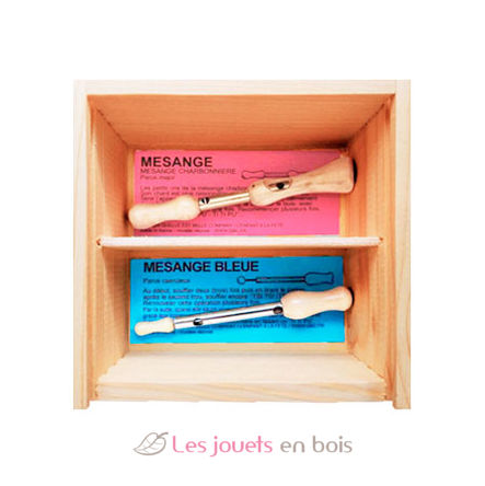 Wooden box with 2 Birds calls : blue tit and great tit.