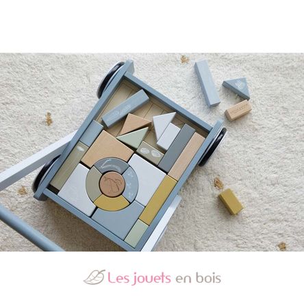 The block trolley is equipped with wooden wheels and is filled with 27 coloured wooden blocks. The different sizes of the blocks stimulate development and guarantee hours of playing and building fun. The handle is at the right height for toddlers.