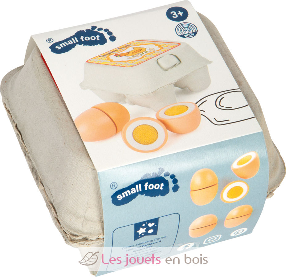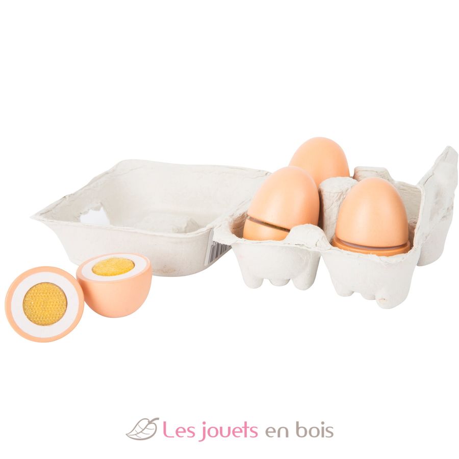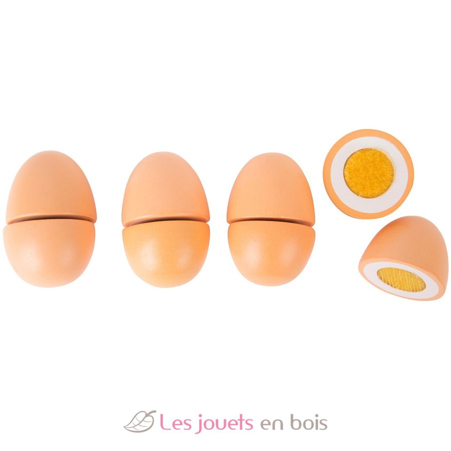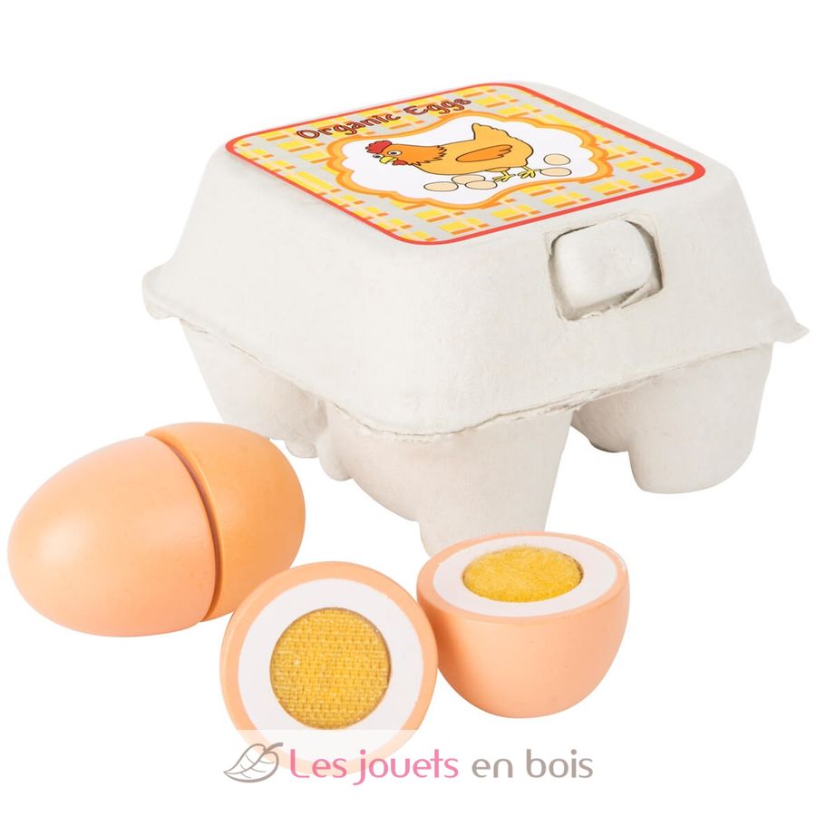 These four eggs made of robust wood offer all sorts of playtime fun. They're held together with Velcro, which allows children to have fun cutting them up to cook them, before reconstituting them. The egg carton made of cardboard stores the eggs for safe transport. So, top chefs, let's fire up the stove!
