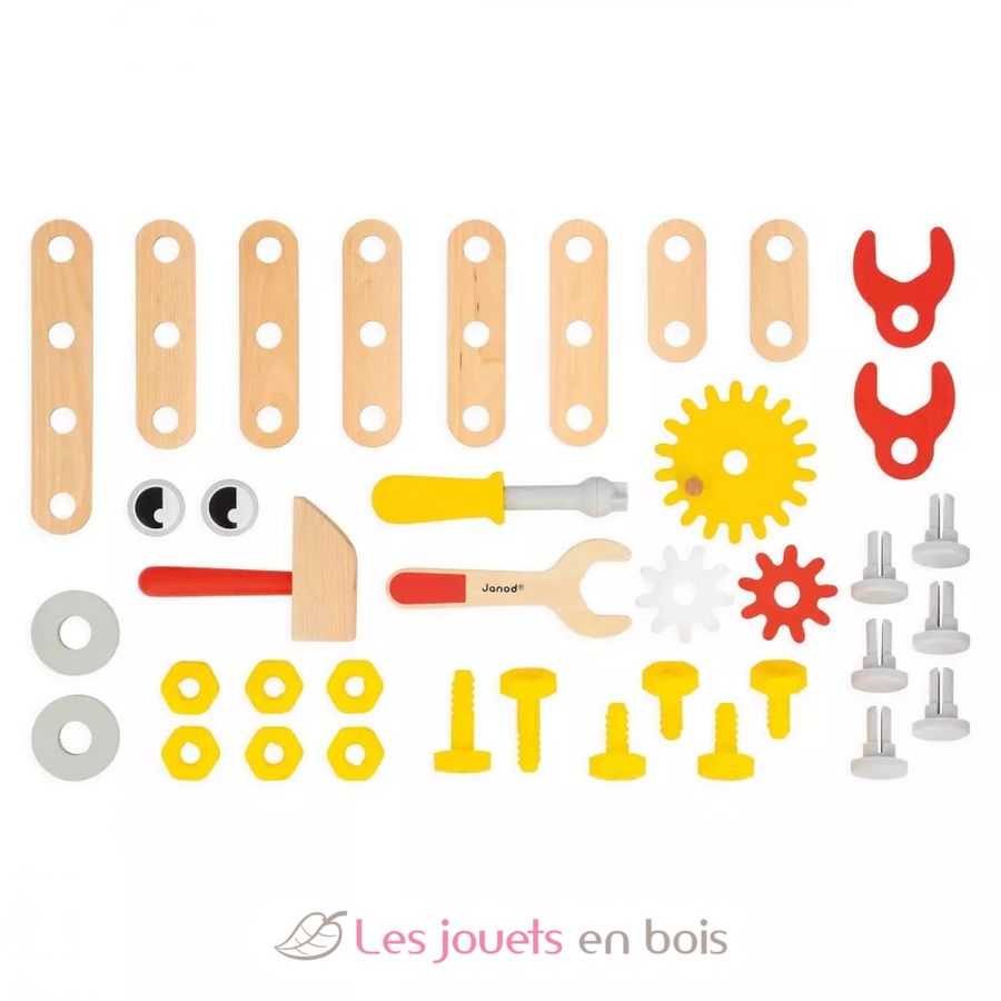 This early-learning toy is full of surprises: 3 magnetic tools on the front, a vice on the side and even a storage space in the centre! Ultra-practical for tinkering and pushing around. This magnetic baby cart contains 38 DIY accessories: 18 wooden accessories (boards and gears) and 20 plastic accessories (screws, nuts, nails). And that’s not all... the screws are equipped with notches for added realism.