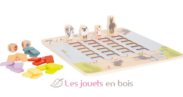 We're off to visit the forest animals! Heinz" the rooster, "Fritz" the horse, "Olga" the cow, and "Schippy" the sheep want to visit the deer and the boar in the forest. The goal of the game is to cross the river that separates the farm and forest! To do this, the four friends have to build a bridge out of the game pieces in bright rainbow colours. Comes with numbered dice with footprints and high-quality game box for storage.