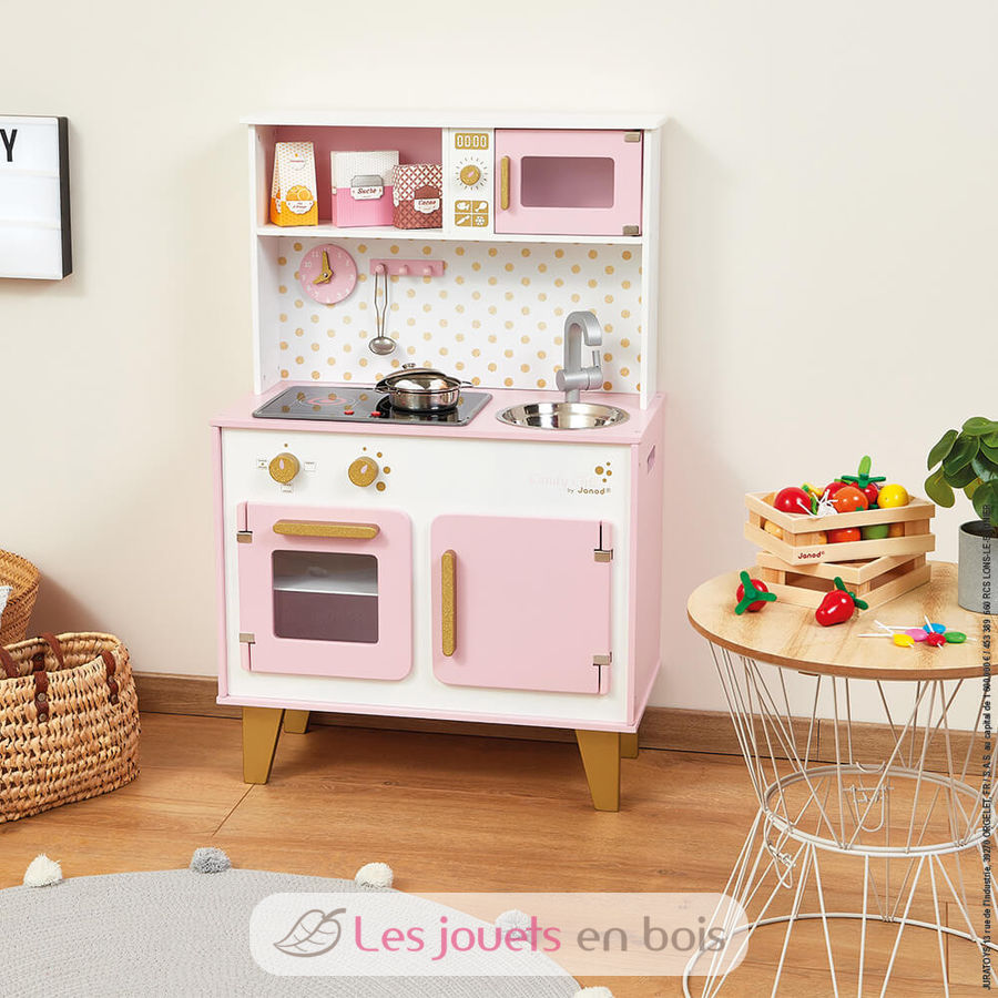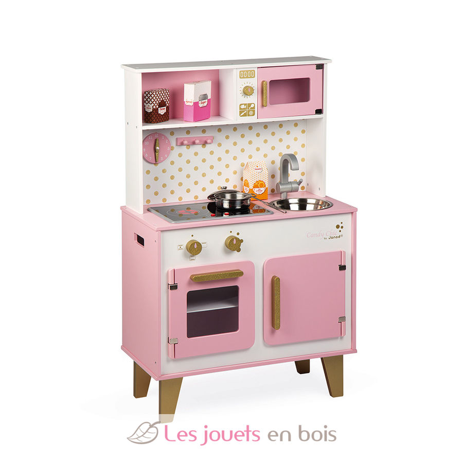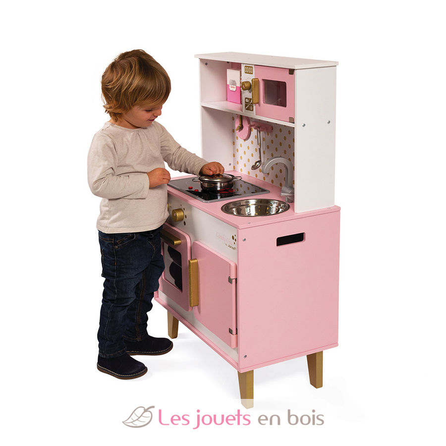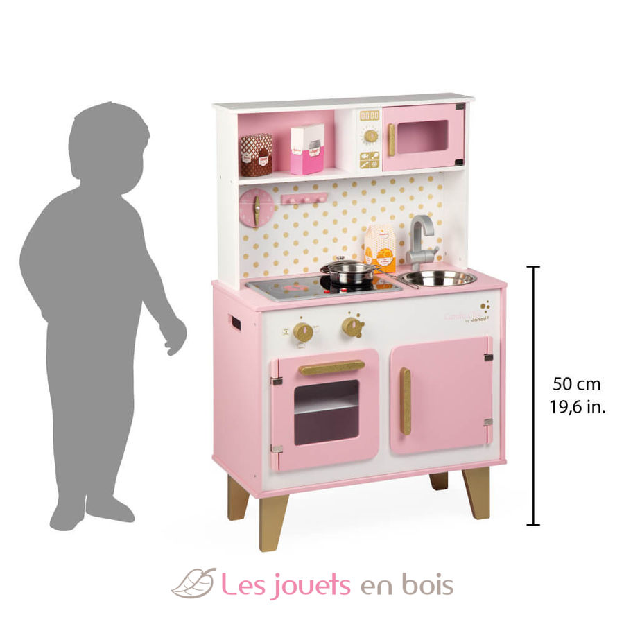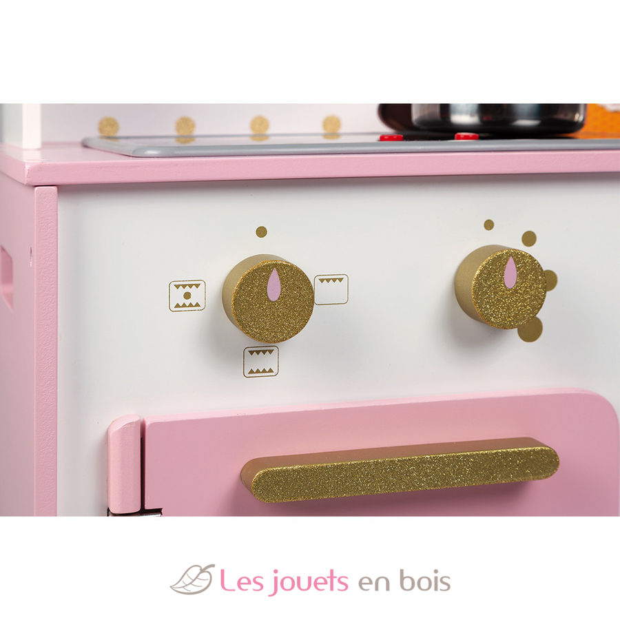 With this pink and golden cooker, children from 3 years old will be able to cook like mom and dad. It is perfectly equipped for the little ones to have fun preparing good meals thanks to its many accessories: a hook to hang the metal ladle, a metal pan and lid and three cardboard food boxes (orange juice, cocoa, sugar). We also love the LED sound induction plate! Just press the red buttons once and the plates light up, then a second time to hear the sound of boiling water. The sound and the induction plates turn off automatically after 30 seconds or if you press the red buttons a third time. This fully equipped wooden children's kitchen also includes an oven and its 3 rotary knobs with sound effects, a microwave, a cupboard for storing accessories, a stainless steel sink and a clock. Height of the worktop: 50 cm (19.7").
