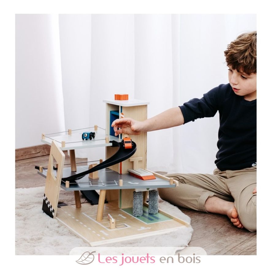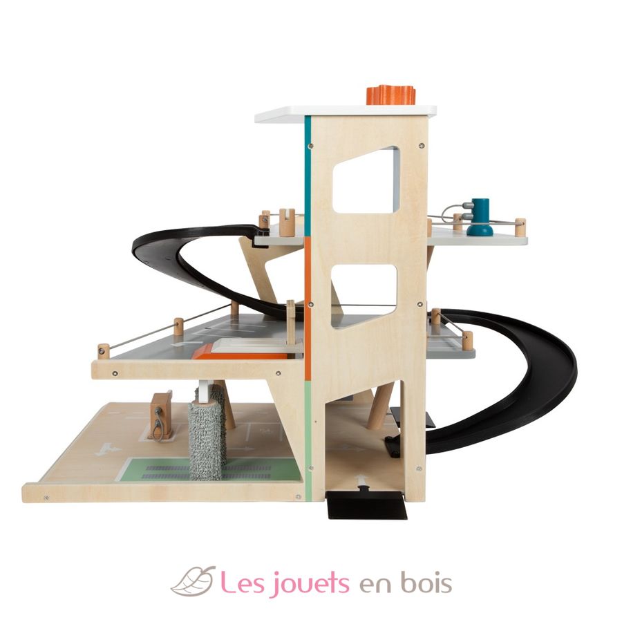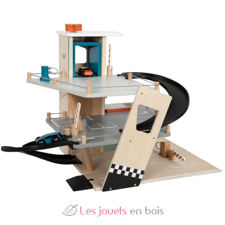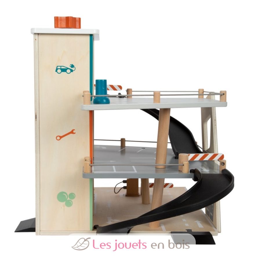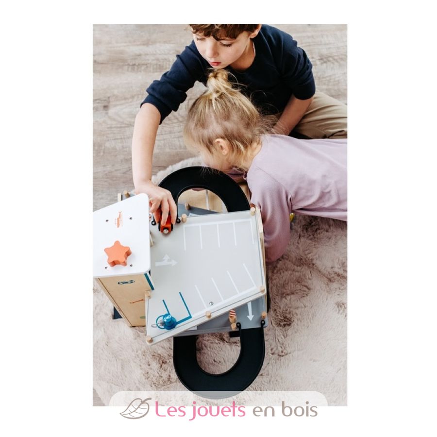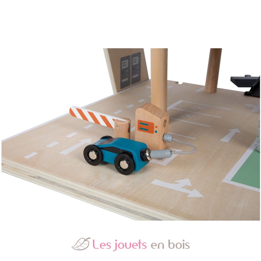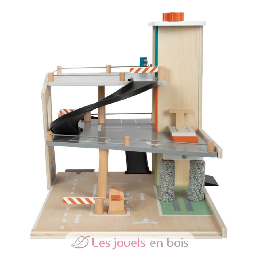 Since this car park has connection points and entry ramps, it can be combined with common wooden toy train tracks or small foot street elements and thereby integrated into existing play worlds.