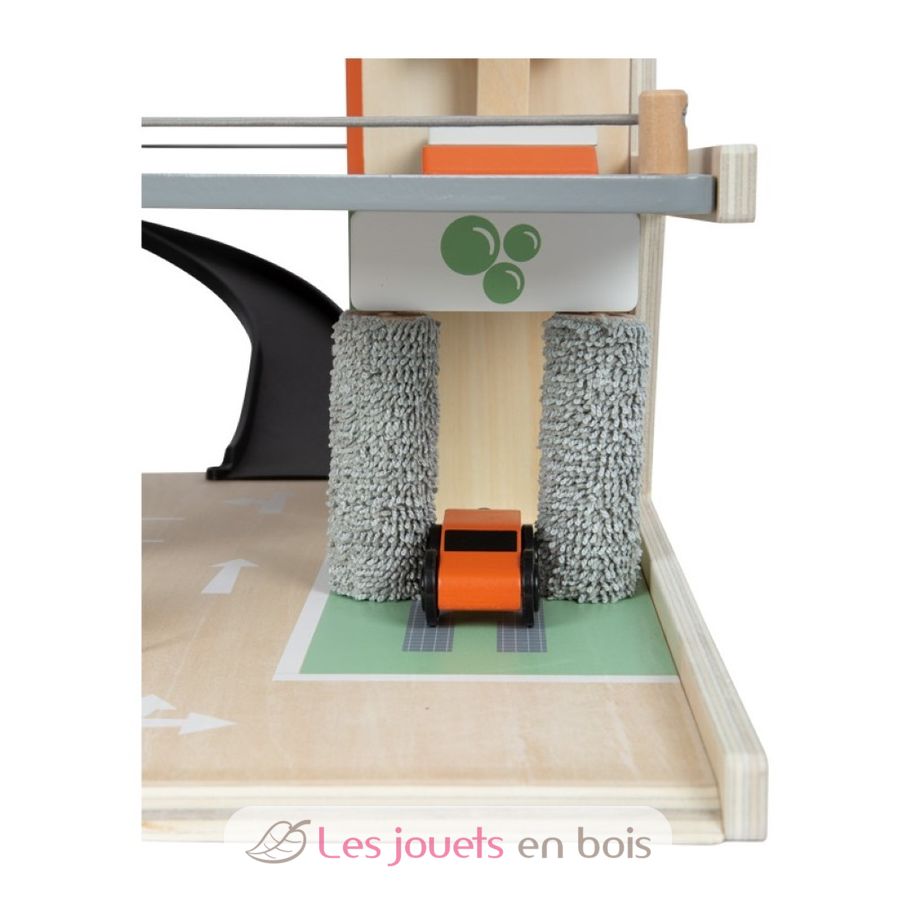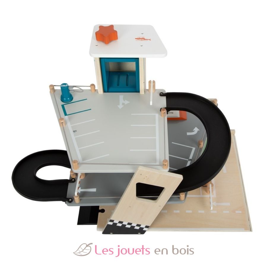The two included cars can be parked on three levels in the garage when they're not filling up at the magnetic petrol pump or charging up at the electric charging station. Everything can be given the once-over in the auto repair shop with the height-adjustable lift before the cars drive through the car wash with moving wash rollers! The car lift that goes between the garage levels is operated by a large handwheel, and a locking mecahnism and ribbed floor surface ensure that the cars get their safely. The flexible rubber bumpers can also be used as a catapult for the cars. Comes with a helicopter landing pad on the lift roof!