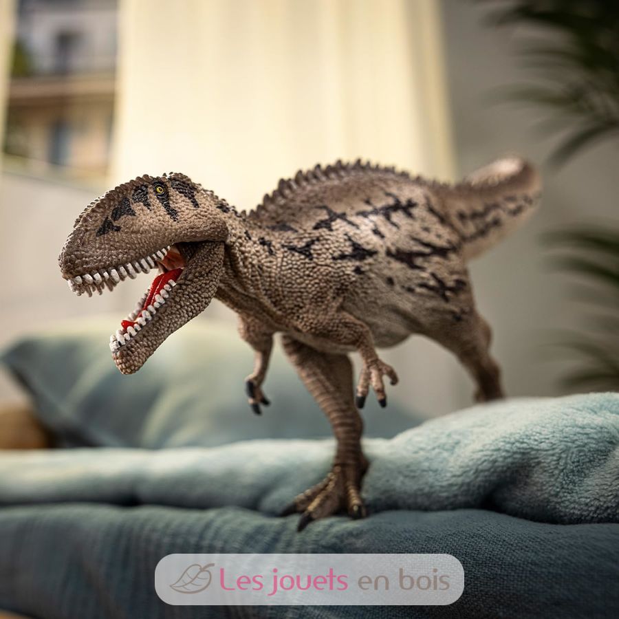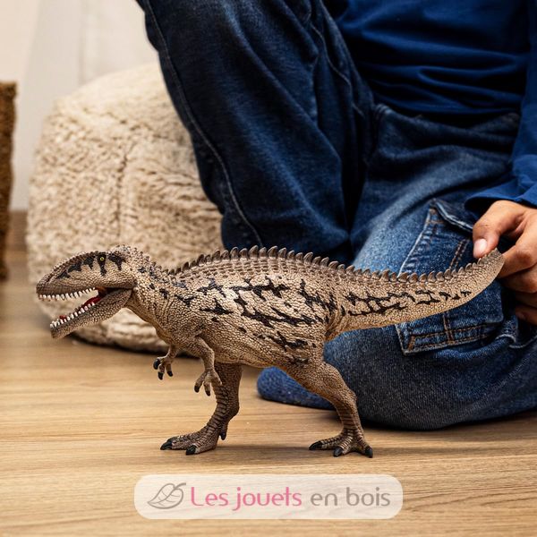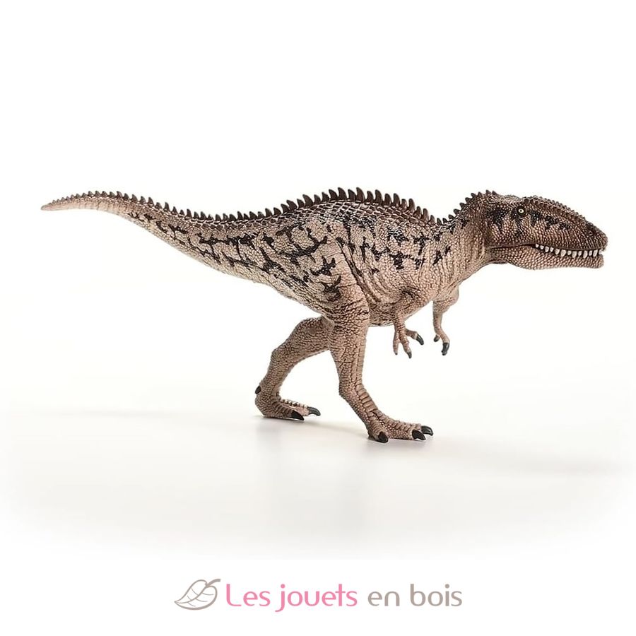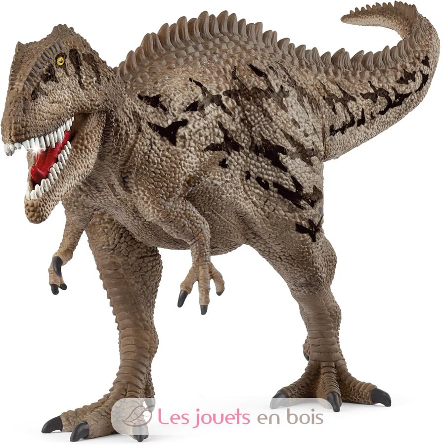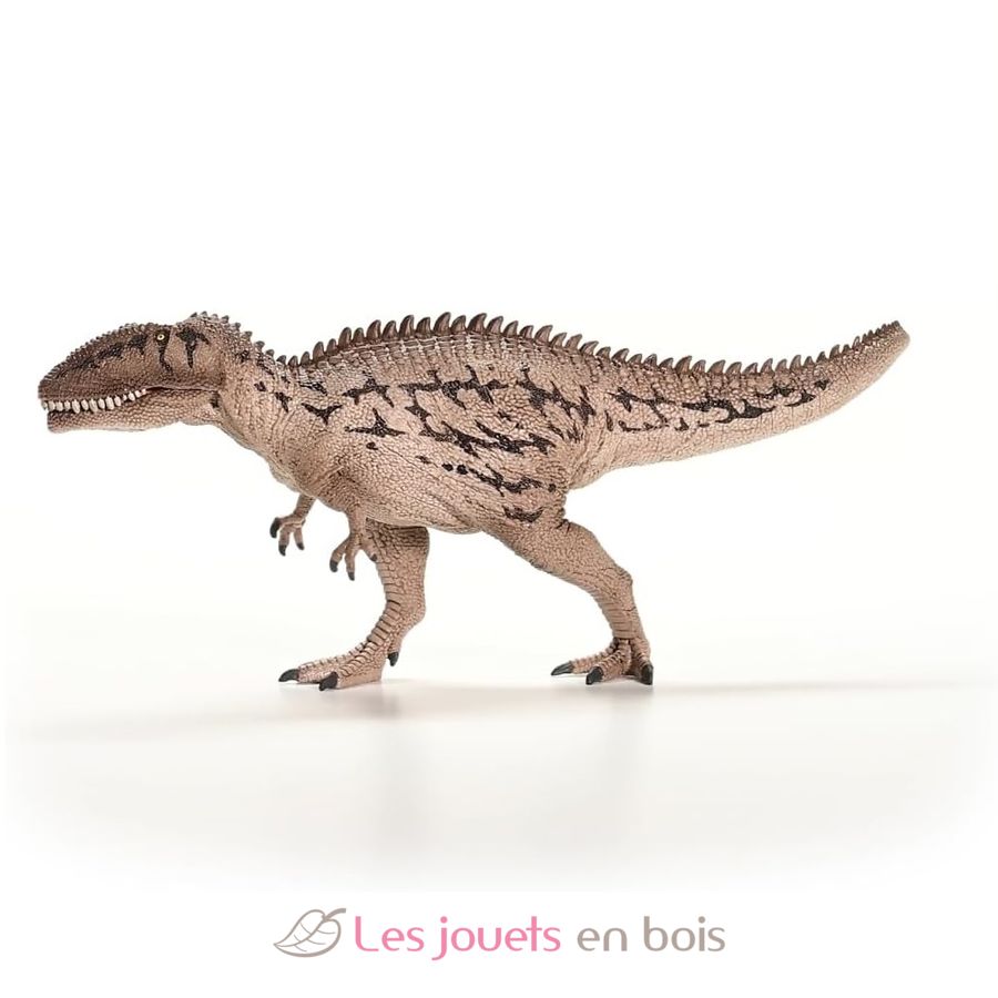 This Carcharodontosaurus sports a superb stone-gray lizard skin with star-shaped brown spots. On its back, it sports a pointed crest that extends to its long snout. The most impressive thing about it is the sharp fangs of its enormous movable jaw. It's best to keep your distance!