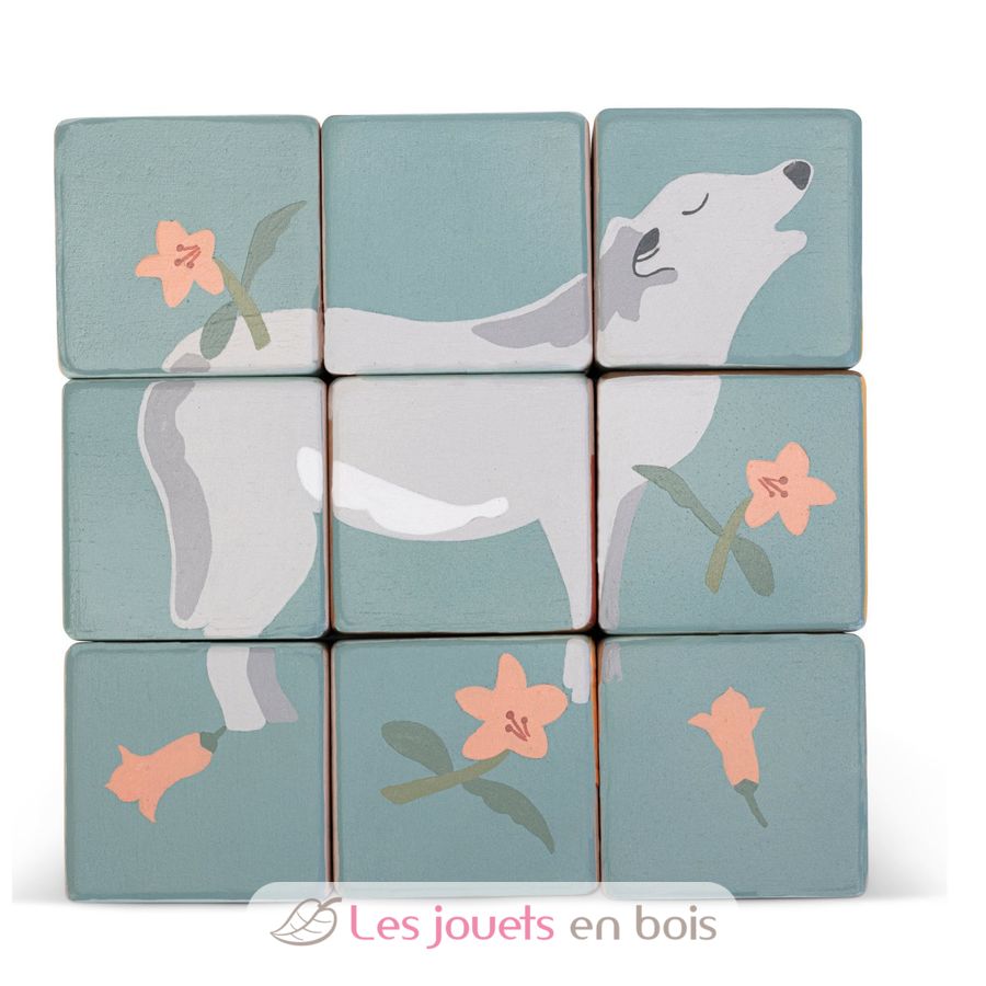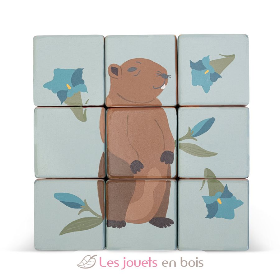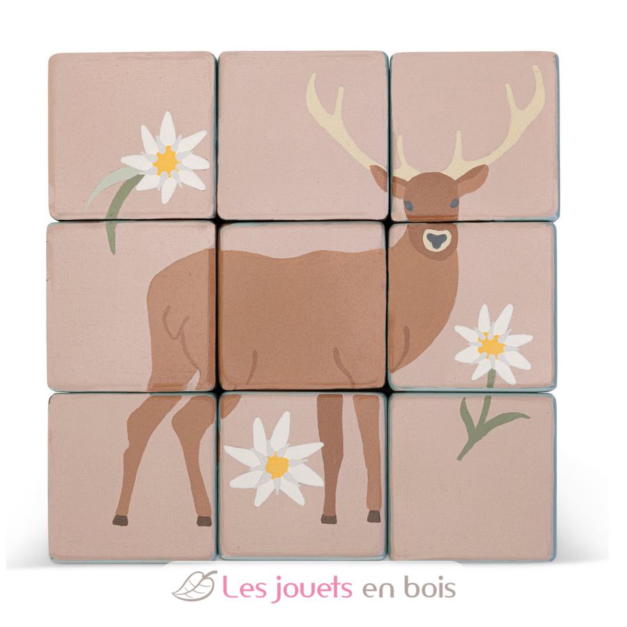 This puzzle is made up 9 wooden cubes that allow you to create 6 animal images, accompanied by floral species typical of the mountain and Dolomite environment.