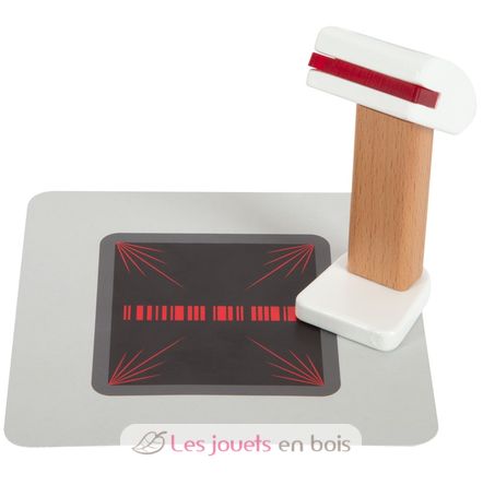 An extraordinary, visually modern cash register made of wood that makes shopping in the kids' play store even more realistic with its many accessories and functions! Accompanied by a hand scanner, paper receipt roll, monitor, scanning surface, debit cards and product cards, and double-sided wooden money pieces, this toy cash register fulfills all wishes. The highlights are the real calculator integrated into the monitor as well as the register drawer with two compartments that opens like a real supermarket till. Incl. wipe-away marker with integrated sponge, for signing on the plexiglass surface. Batteries not included.
