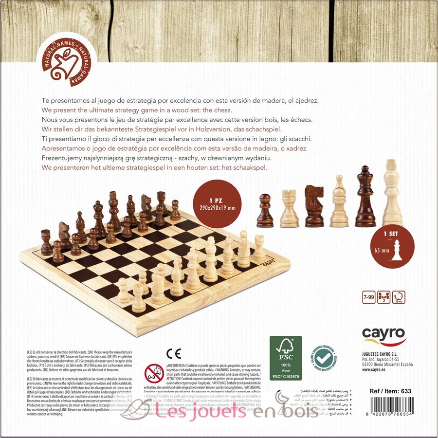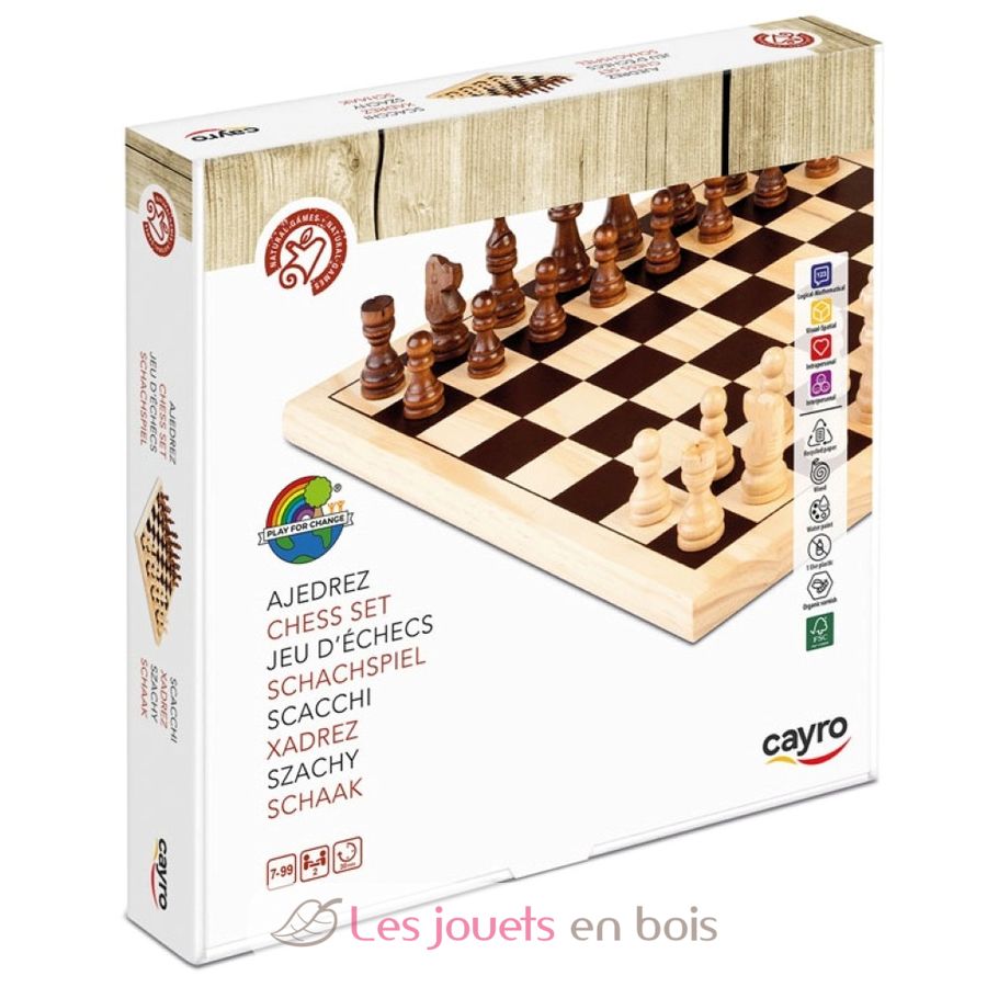 A wooden chessboard measuring 30x30cm. The squares have been painted and later matte varnished. Includes a set of wooden chess pieces. Presented in a recyclable cardboard box with a modern design.