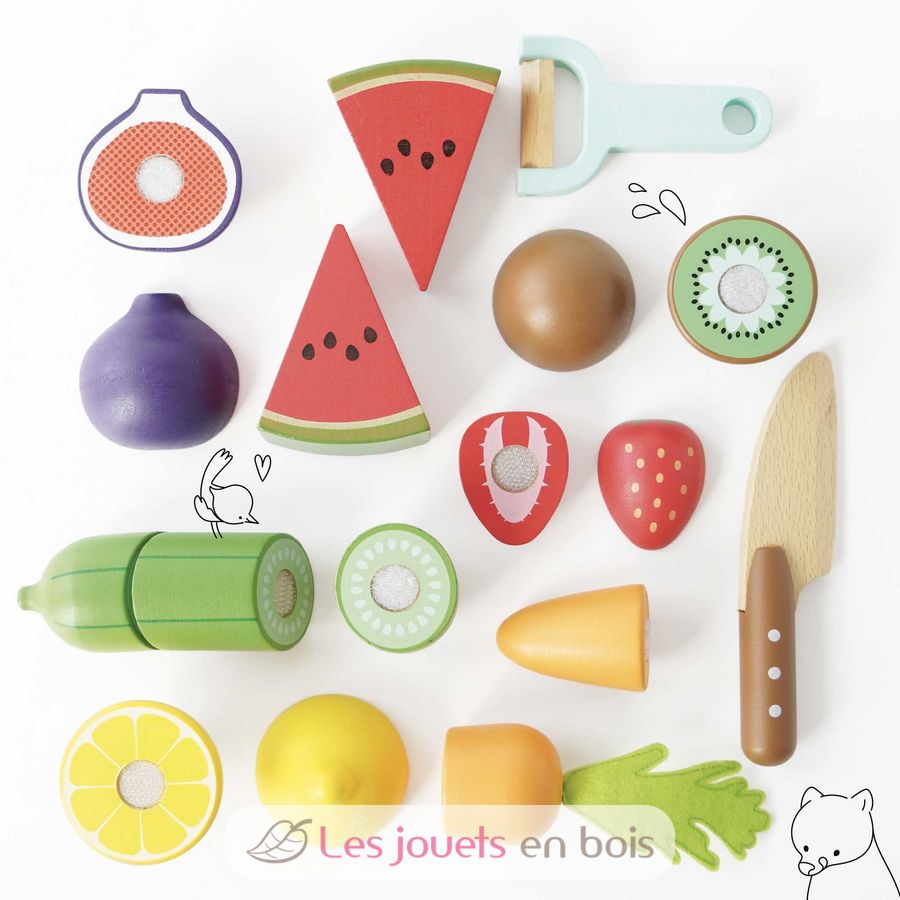 This set includes 18 piece : a natural wooden chopping board, peeler, knife plus a selection of tasty looking fruit and veggies that can be ‘chopped up’ using the clever Velcro detailing.