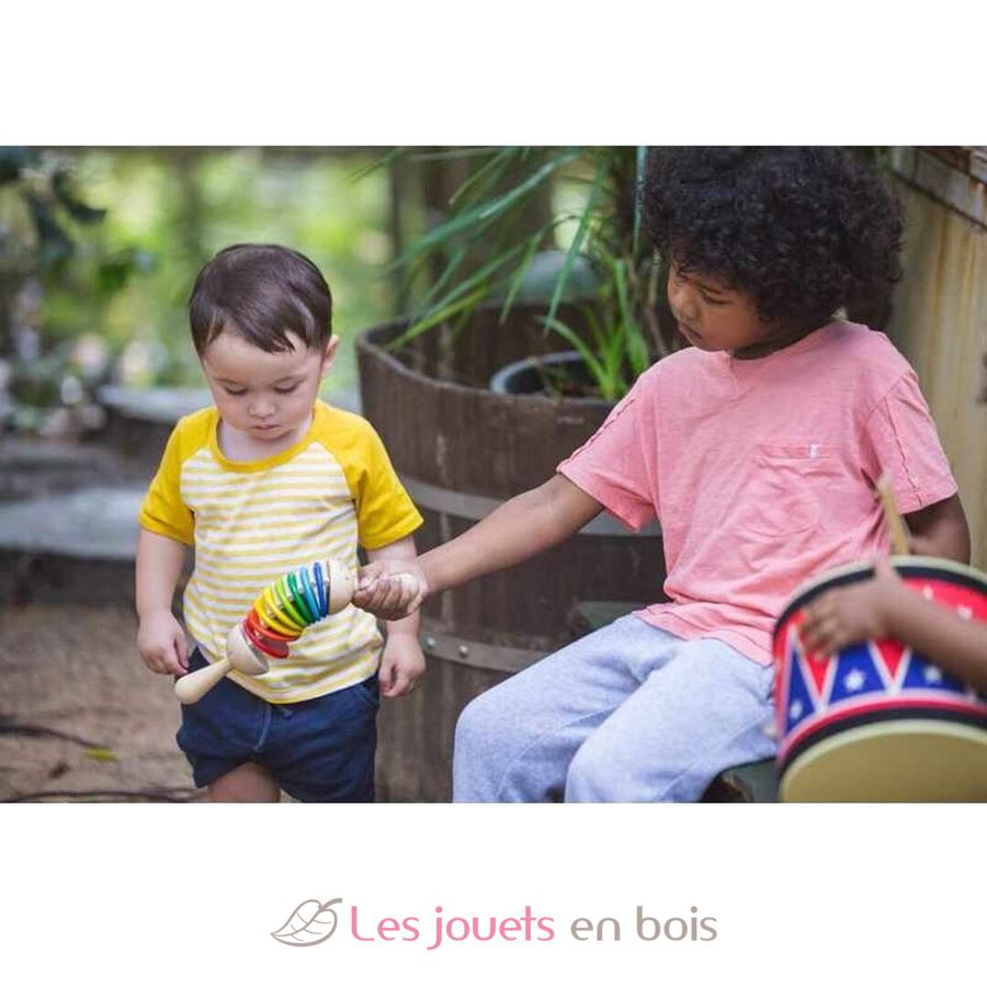 Using an alternating up and down motion with both hands, the colorful segments of this wooden percussion toy will create various click-clack sounds.