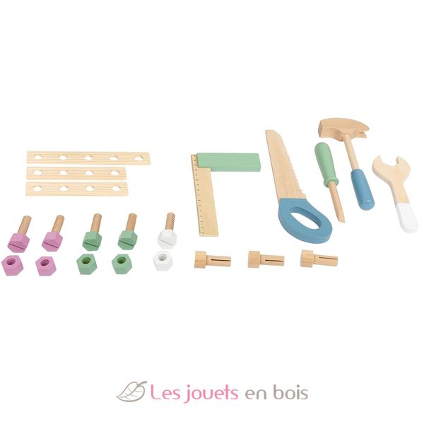 With this workbench made of wood, children´s manual crafting skills can be put to the test. By practising twisting, sawing and screwing, they will also train their fine motor skills. The soft colours, clear shapes and simple Nordic design is attractive to both girls and boys.