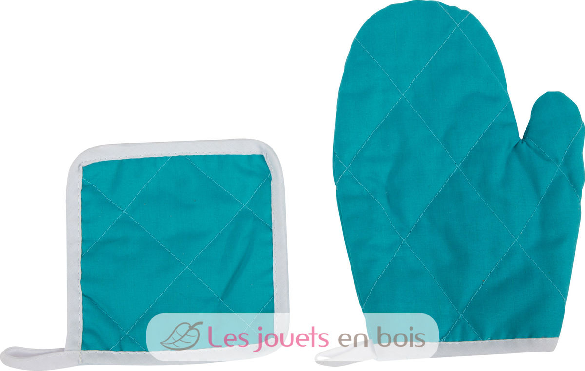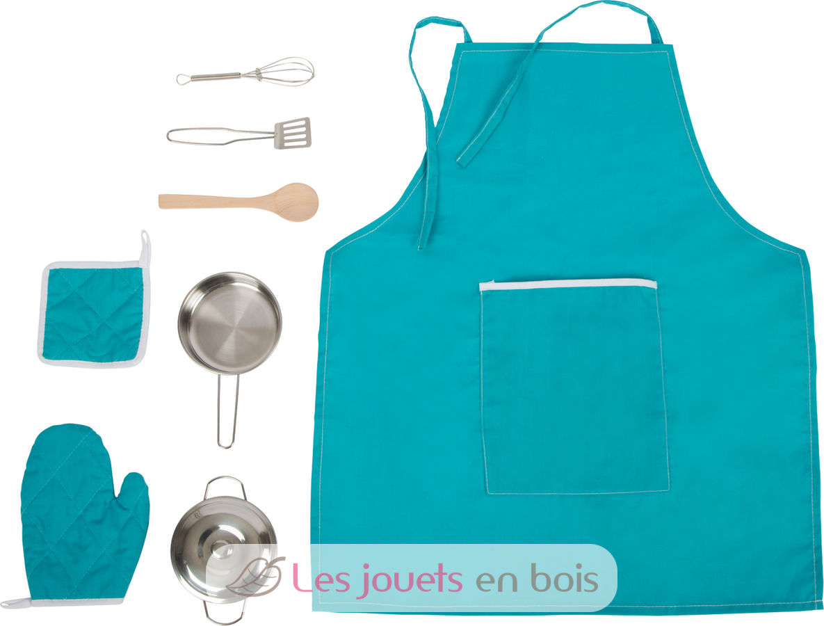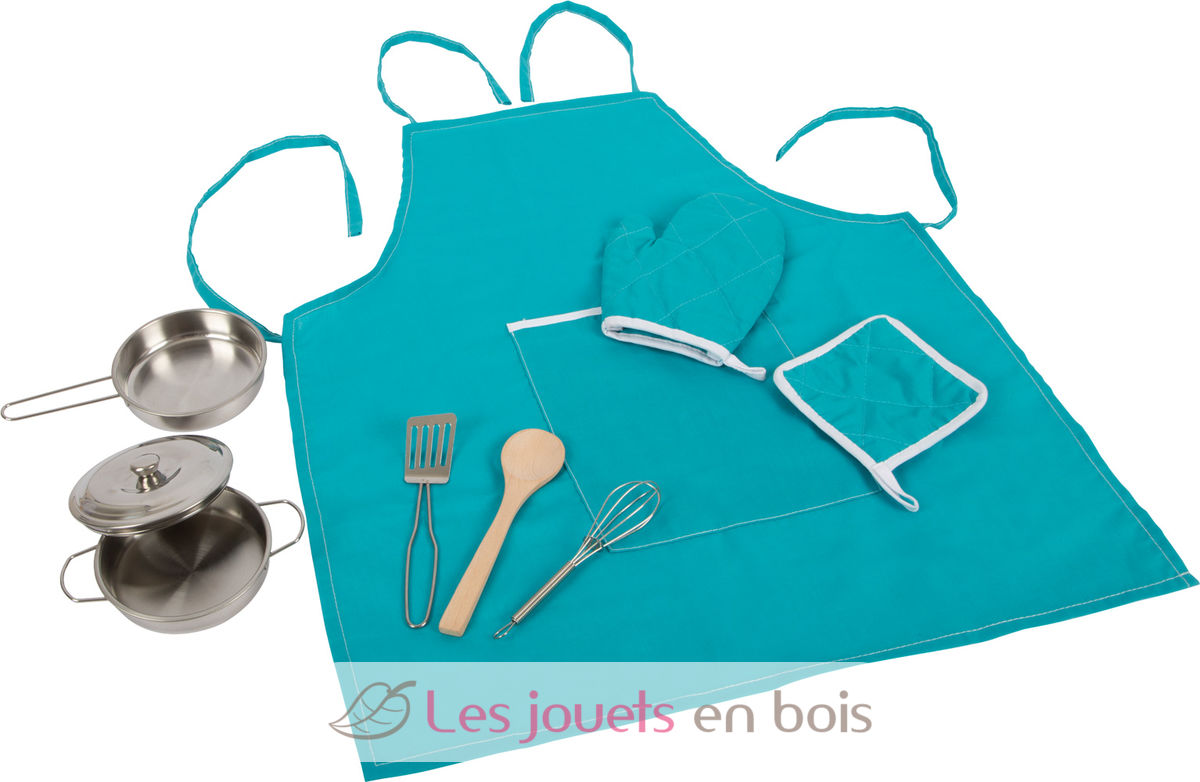 With this kitchen/cooking set, young gourmet chefs will whisk like the pros in their play kitchens! With a pot with a lid, pan, whisk, spatula, and wooden spoon as well as a children's apron, potholder, and padded oven mitt, all wishes will be fulfiled in the play kitchen.