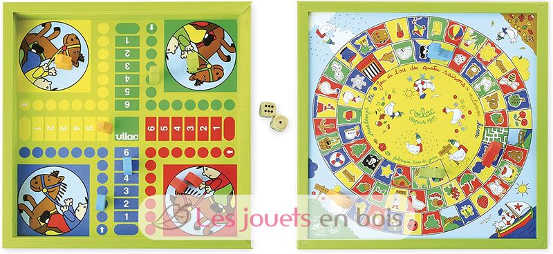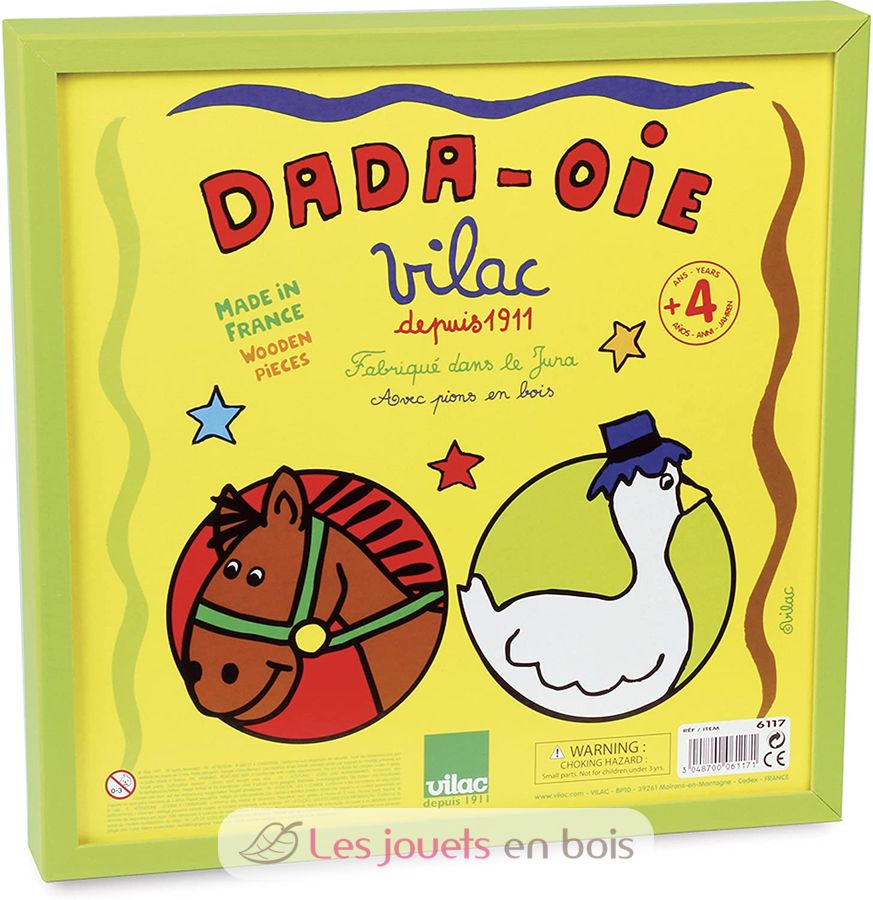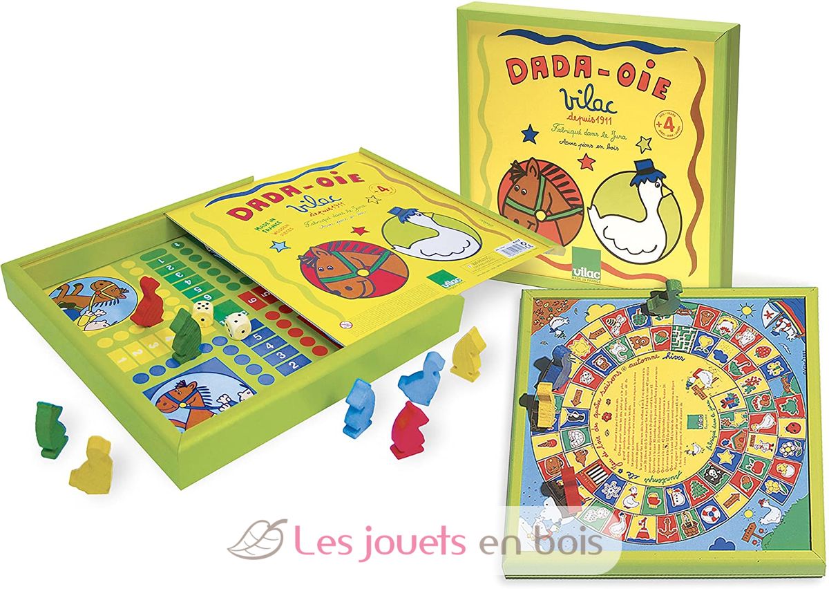 Wooden Dada oie game (in french). A pretty play of goose and a set of small horses in a sawn timber box. Under the wood lid of this box, two impossible to circumvent board games for the small ones. This board game of great quality is manufactured in the Jura in France by Vilac. Réf 6117