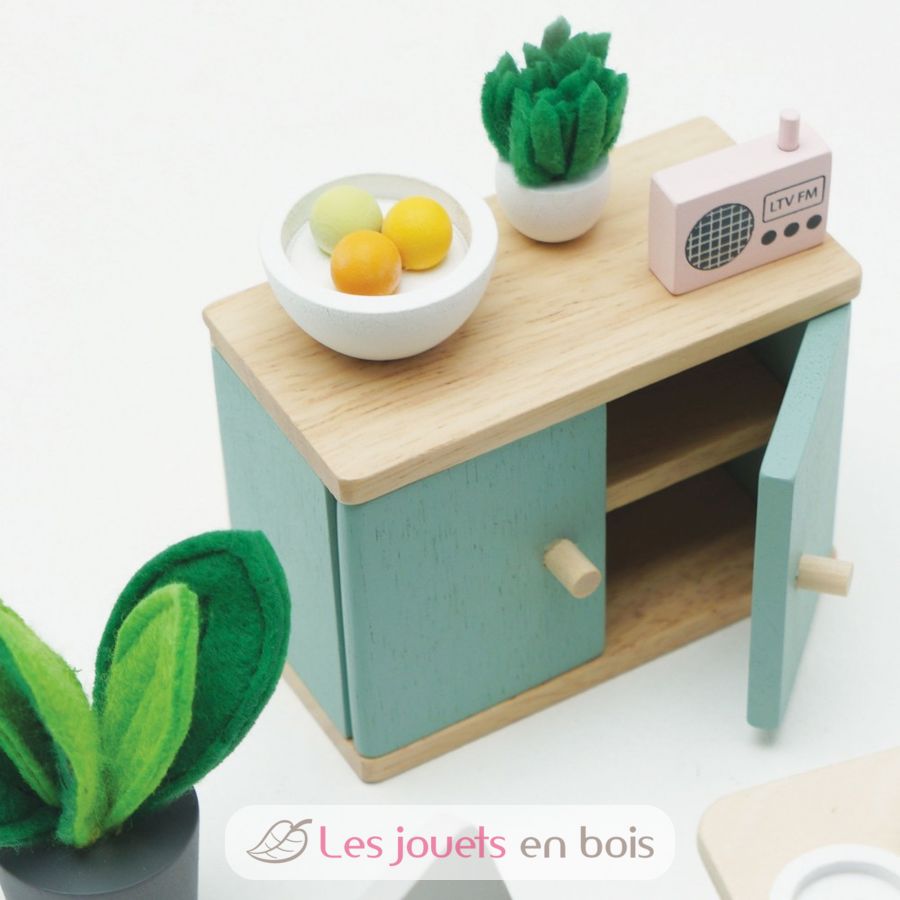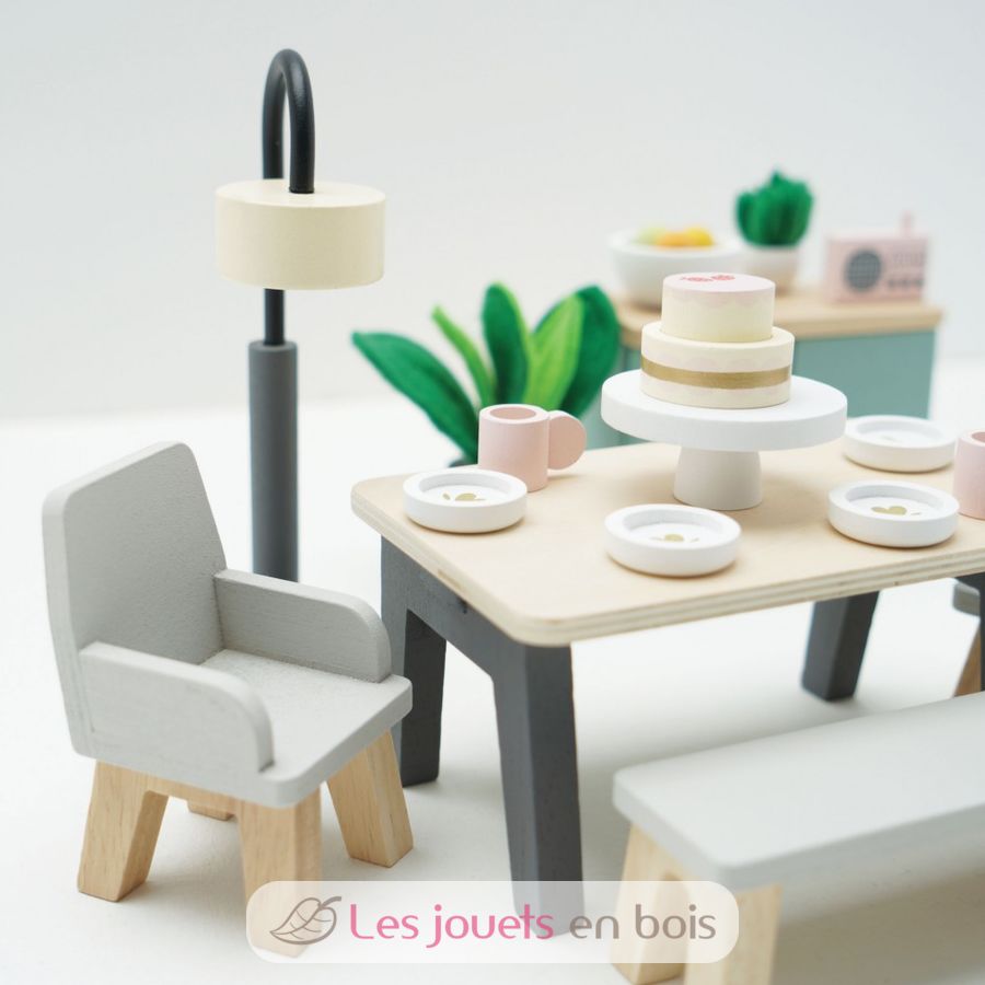 Stylish and sustainable, this 18 piece furniture set is made from FSC - certified wood and features: a smart wooden table with two co-ordinating chairs plus a bench, a free standing lamp, sideboard, 2 pot plants with realistic felt leaves, a fruit bowl complete with wooden fruit, a radio and, to top it all off, 4 dinner plates, cups and a showstopper cake arranged on a stand – the perfect table centrepiece to tempt little dinner guests.