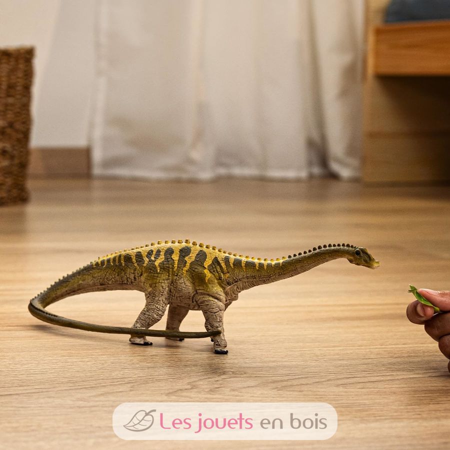 The diplodocus is a prehistoric giant: it measures 27 meters long, including 6 meters just for its immense neck. What's more, it can weigh up to 16 tons even though it's vegetarian! With its wide mouth, it must laboriously chew branches for hours before finally being satisfied. This activity keeps it occupied for quite a while!