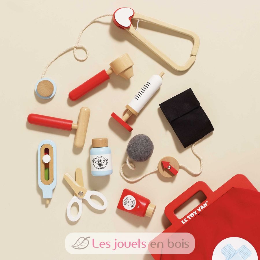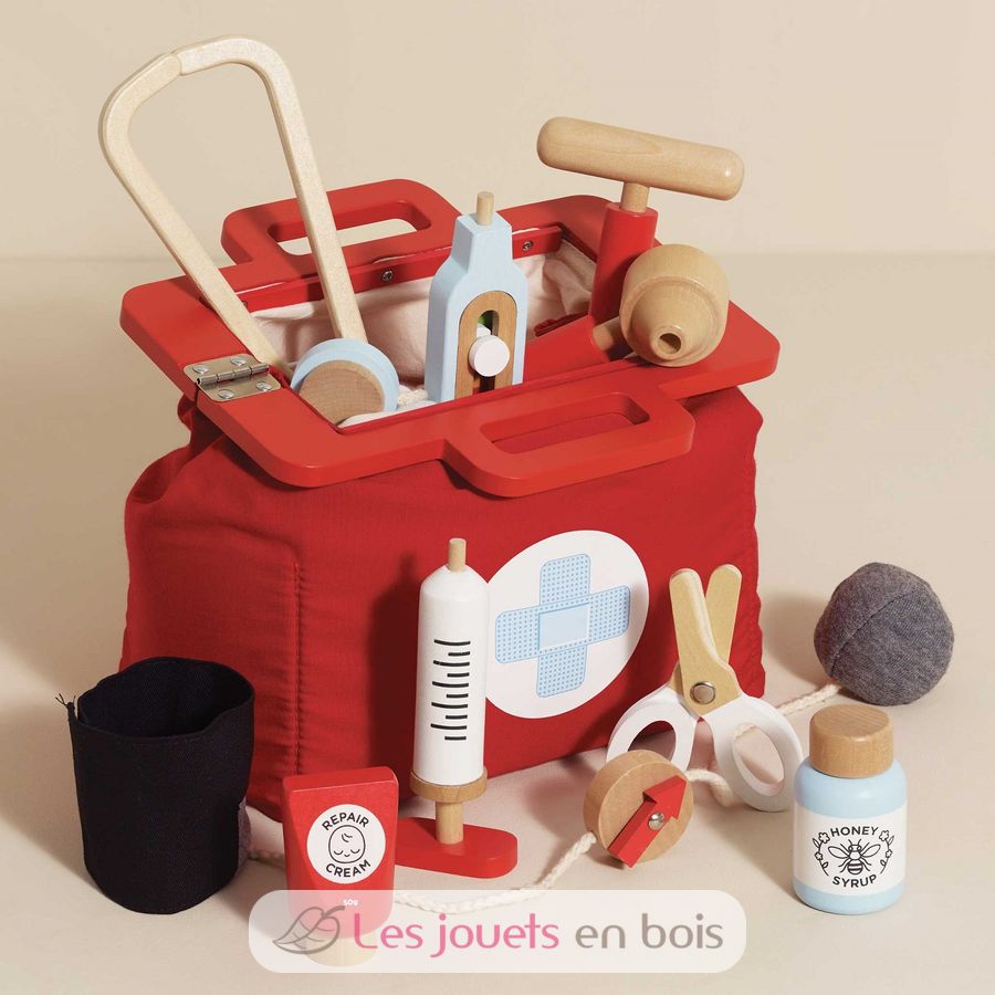 Doctor Doctor ! A vintage style, child sized ,fabric Doctor's Bag filled with wooden medical instruments and bottles. The set includes a toy stethoscope, thermometer, syringe, blood pressure gauge, ear scope,reflex hammer, scissors and two medicine bottles. For ages 3+