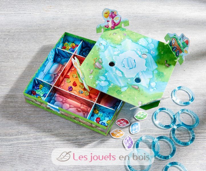 Content : 1 dragon dad, 1 box base with 4 dividers, 1 game board, 4 dragon children, 9 ice rings, 90 sparkling stones (18 in each of 5 colors), 5 sparkling stone tiles, 1 ice floe tile, 1 set of instructions.