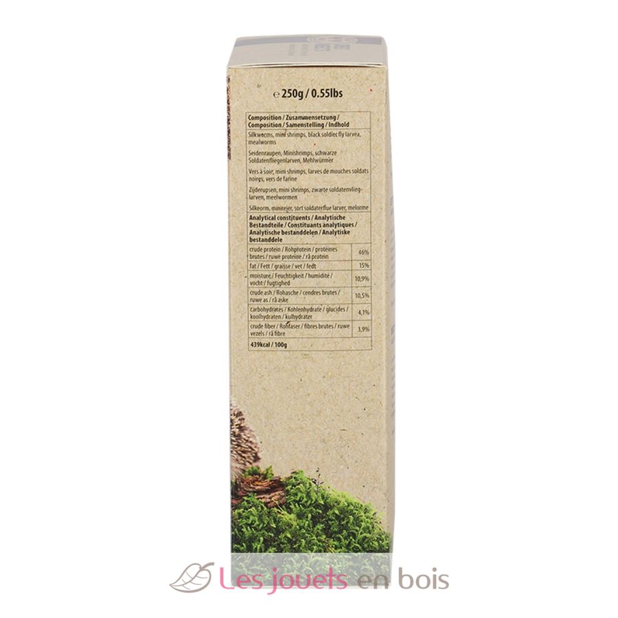 Rich in proteins, it consists of silkworms, mini shrimps, black soldier fly larvae, mealworms. Netto Weight: e 250 g.