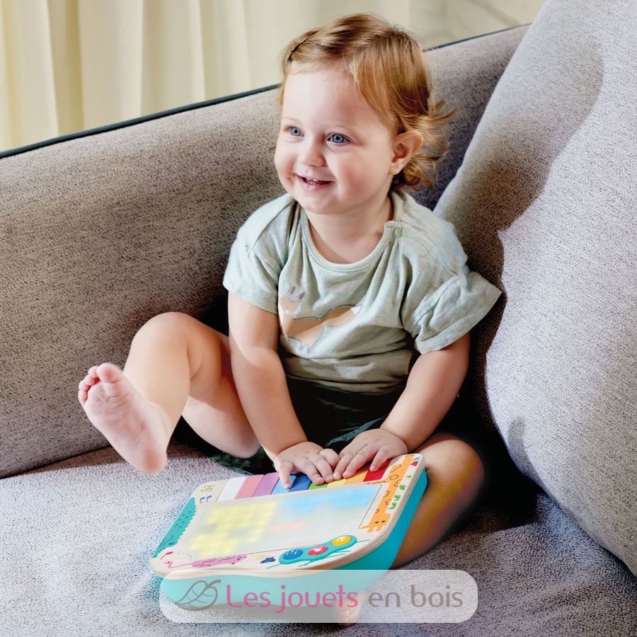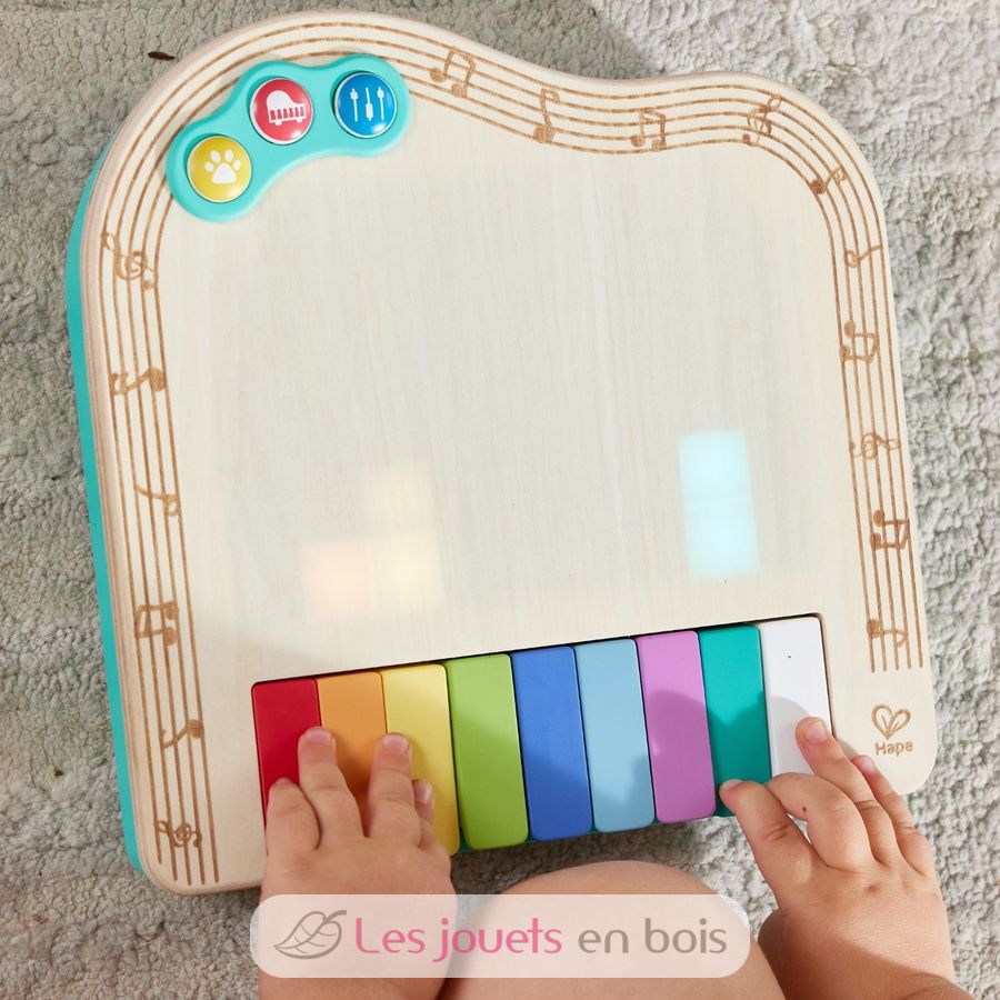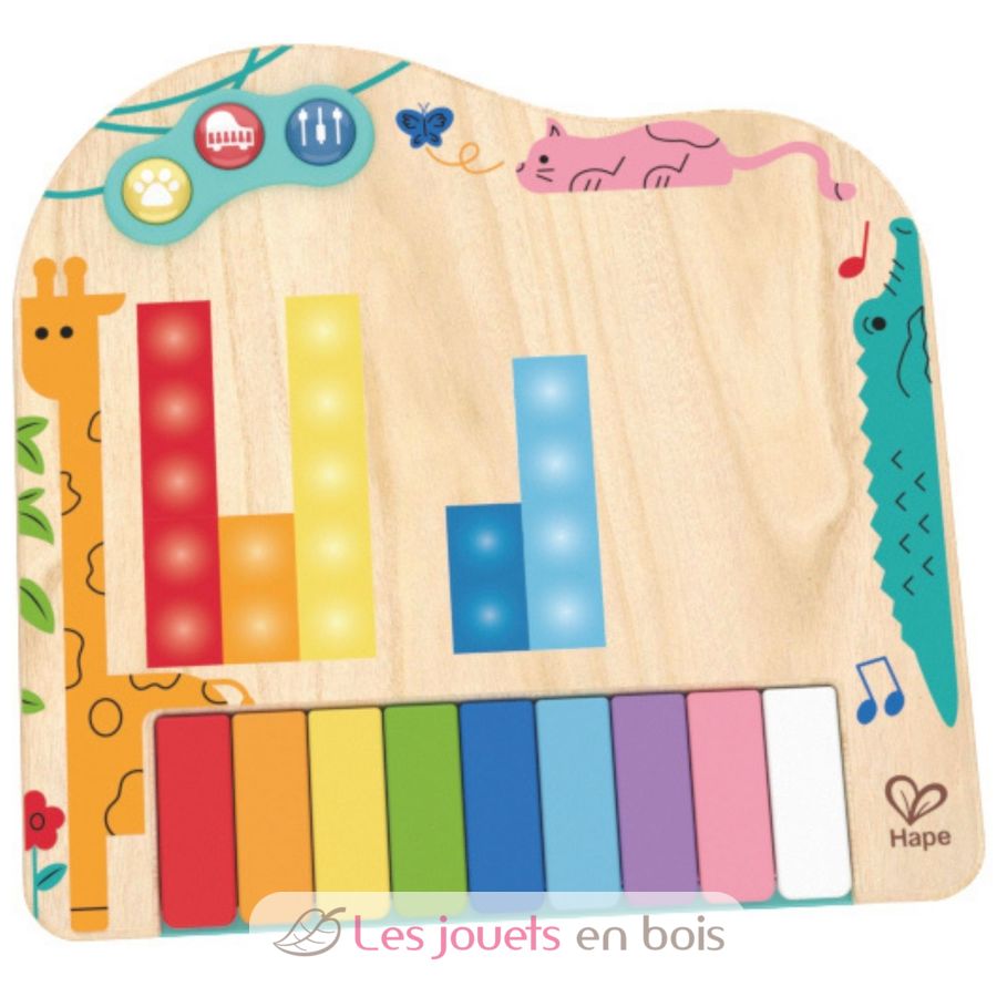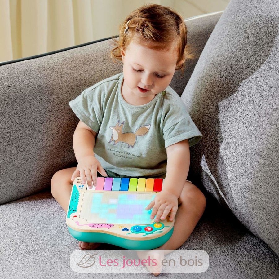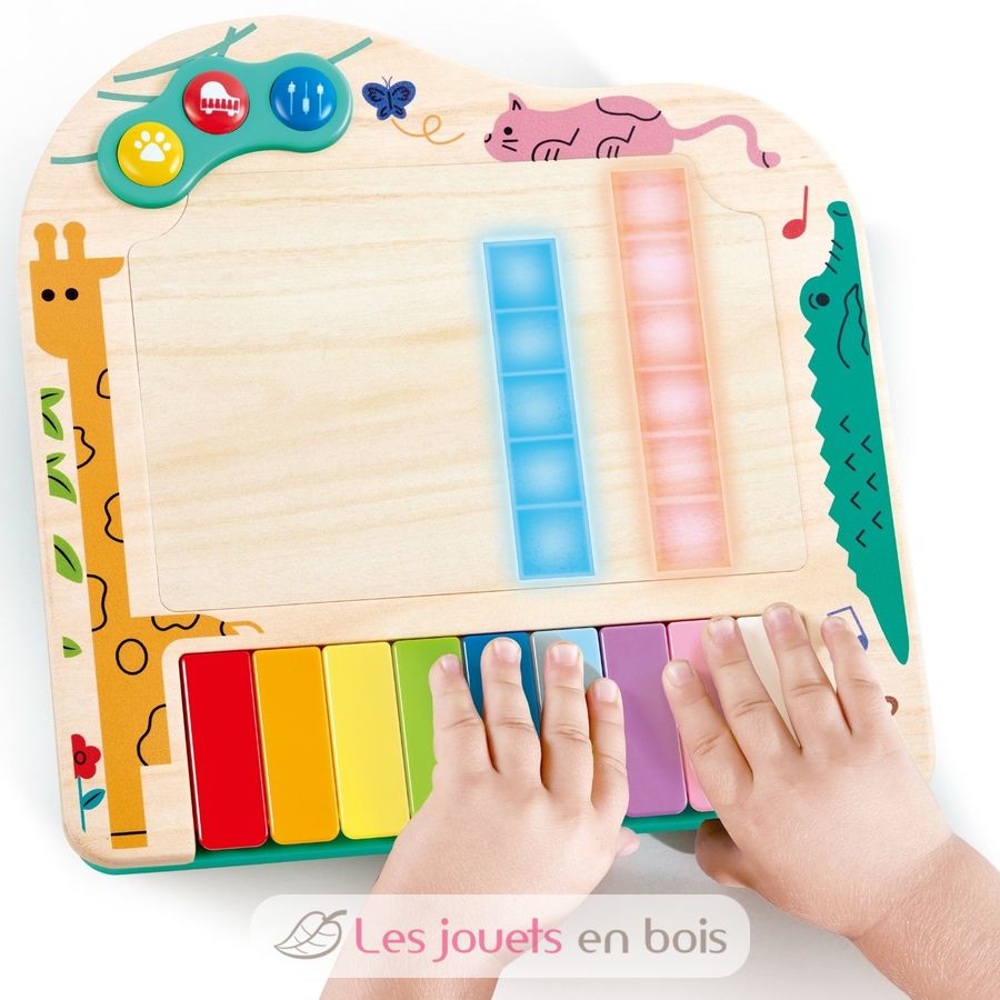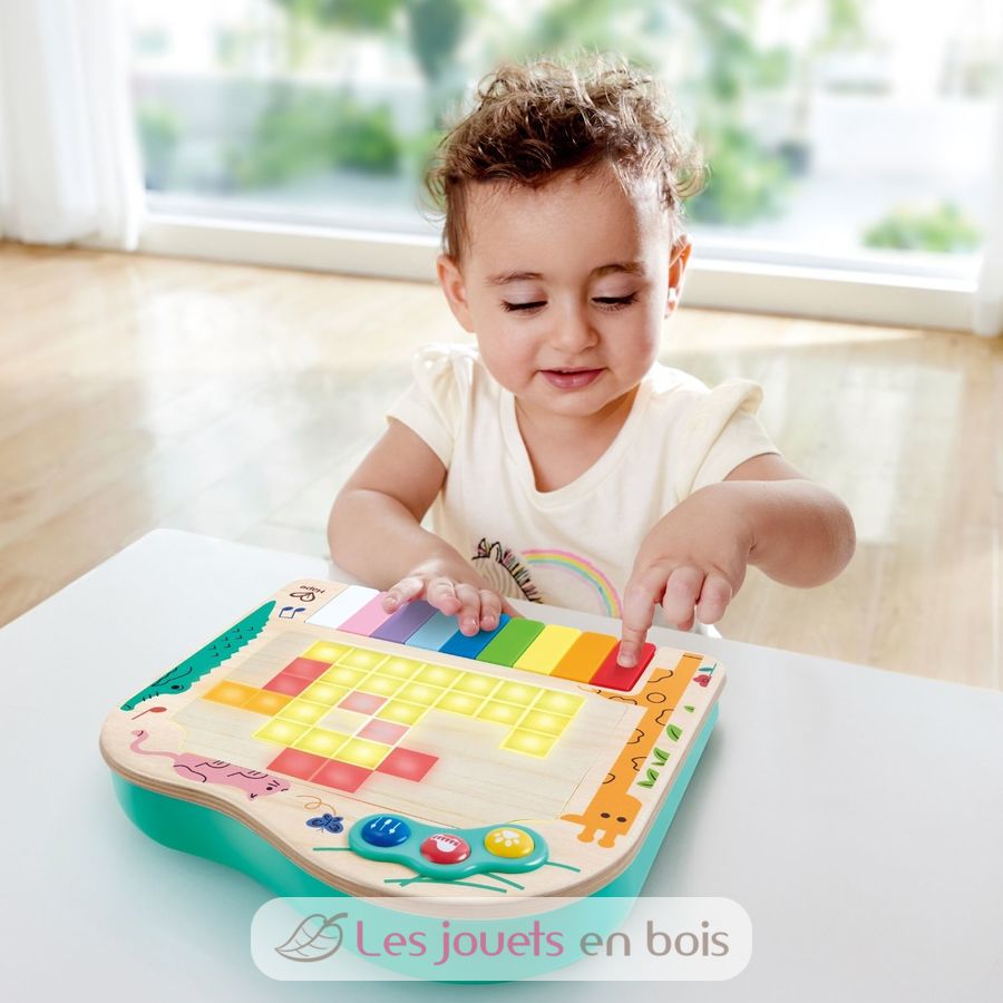 Three musical play modes allow children to explore colors, animals, and melodies. The wooden surface transforms into a pixelated screen, revealing animals and vivid colors.