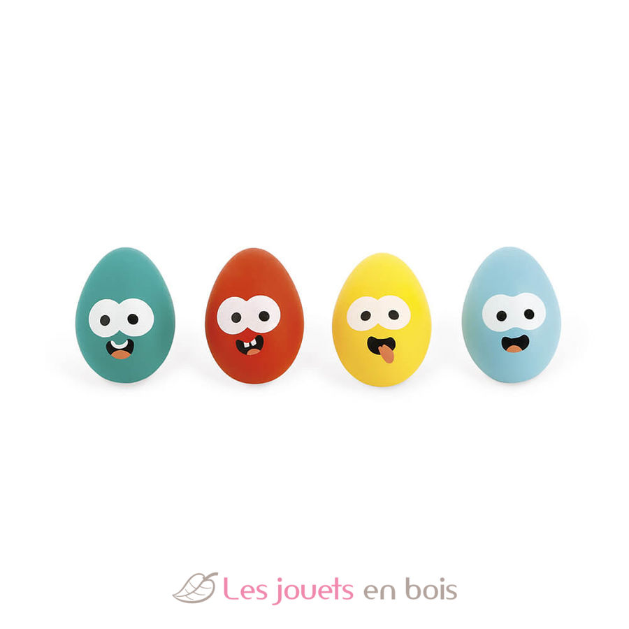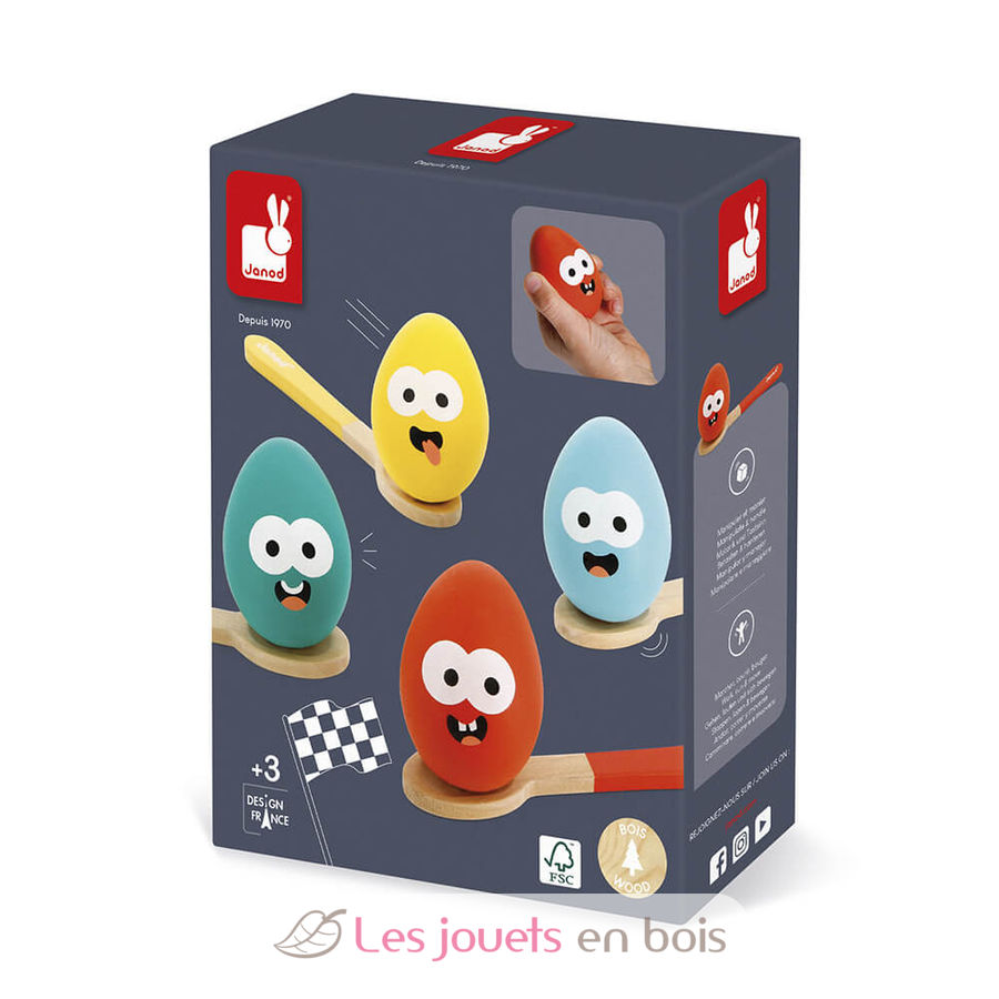 This game consists of 4 wooden eggs (6 x 4.5 cm) and 4 wooden spoons (13 x 5 cm), for children from 3 years old.