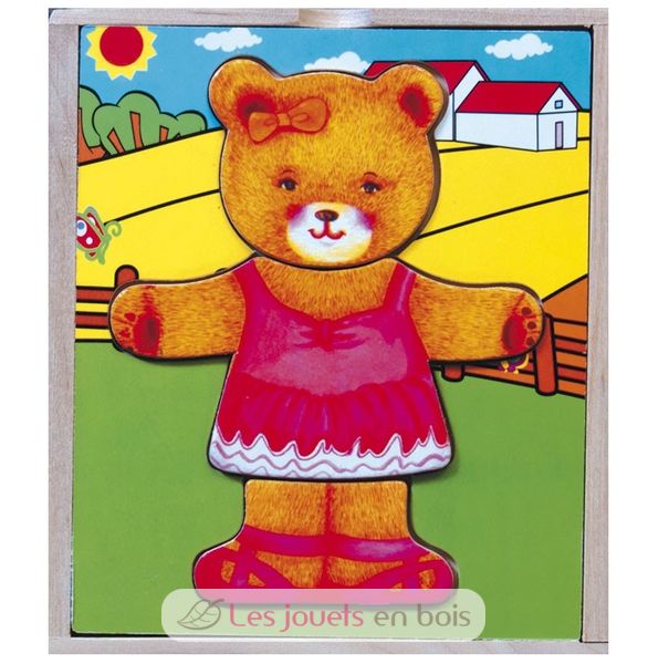This wooden puzzle contains 18 pieces to fit together: 6 bodies, 6 pairs of shoes and 6 faces with different moods, for a total of 216 possible combinations! The child therefore learns to recognize shapes, colors and moods.