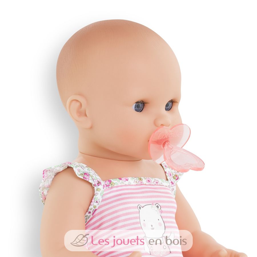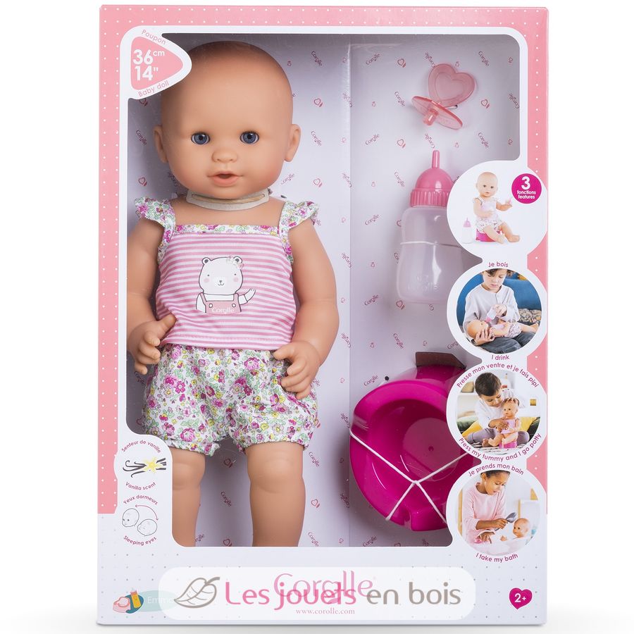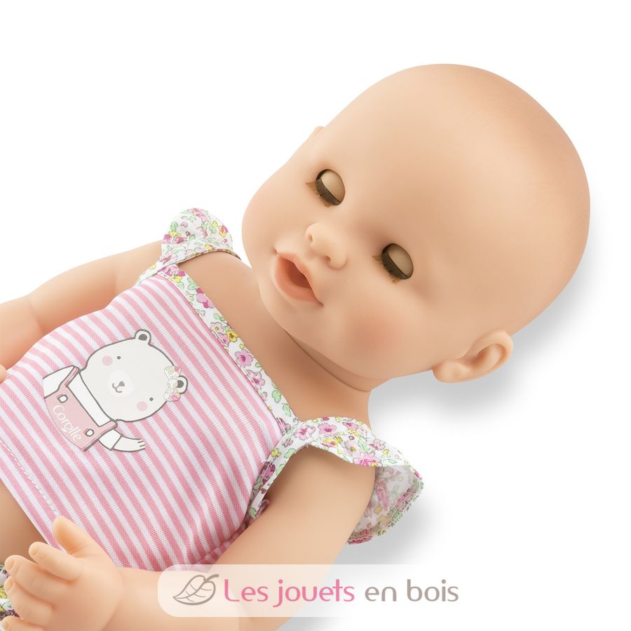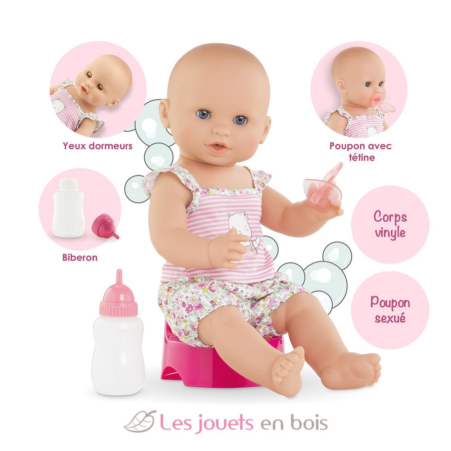 This very realistic doll sits up on its own. It can go into the water safely, thanks to its all-vinyl body. It has a delicate vanilla scent, a signature of Corolle dolls. With its sleeping eyes, it closes to sleep when laid on its back. It can take a pacifier or suck its thumb.