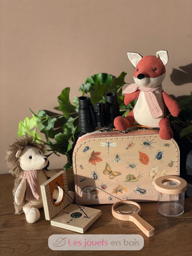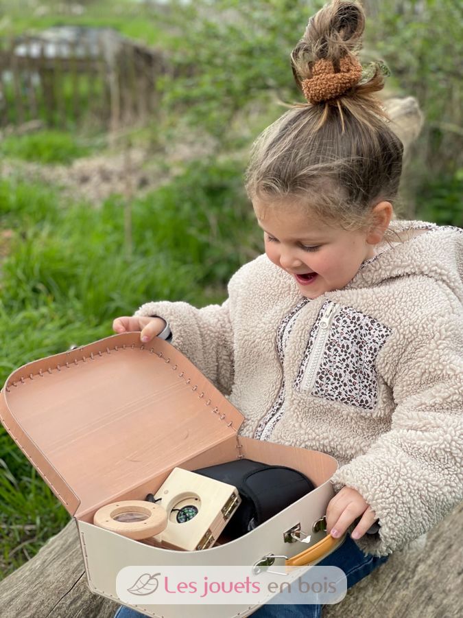 This case contains : binoculars (x4 magnification), a wooden compass with sundial, a wooden magnifying glass and an insect observation box.
