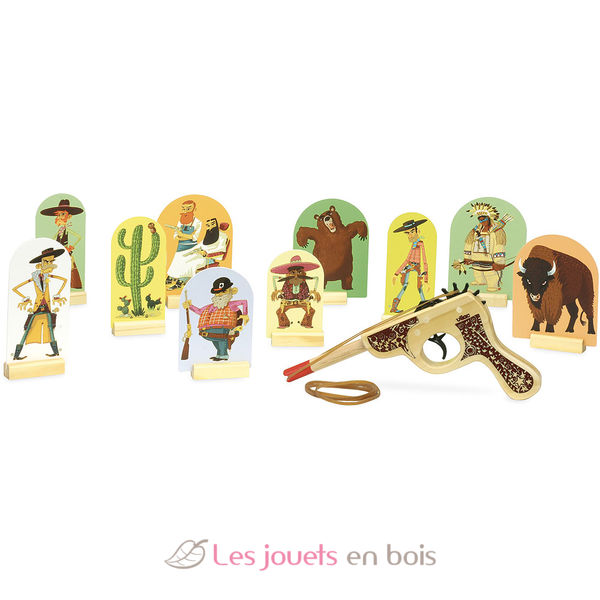 Wooden Gun in wood with 5 Rubber Band and 10 targets made by Vilac, item number 9911.