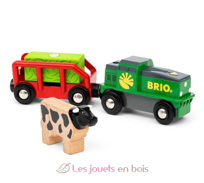 Take the animals out to pasture with the Farm Battery Engine. Designed with toddlers in mind, this battery-operated toy train features a simple tap and go function for frustration-free play. Just push down on the front of the engine to start moving, then bring it to a stop by pushing down again. Place either the wooden cow or wooden hay load into the wagon and attach it to the toy train using the classic Brio magnetic connectors before setting off.