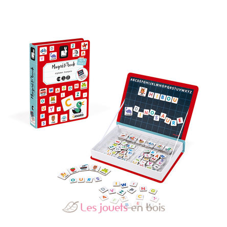 French Alphabet Magneti'book is a magnetic educational game in cardboard to learn the alphabet in French. Composed of 26 illustrated magnets and 116 letters magnets. Once the book is opened, the aim is to write correctly on the stage the word indicated on the illustrated magnet.