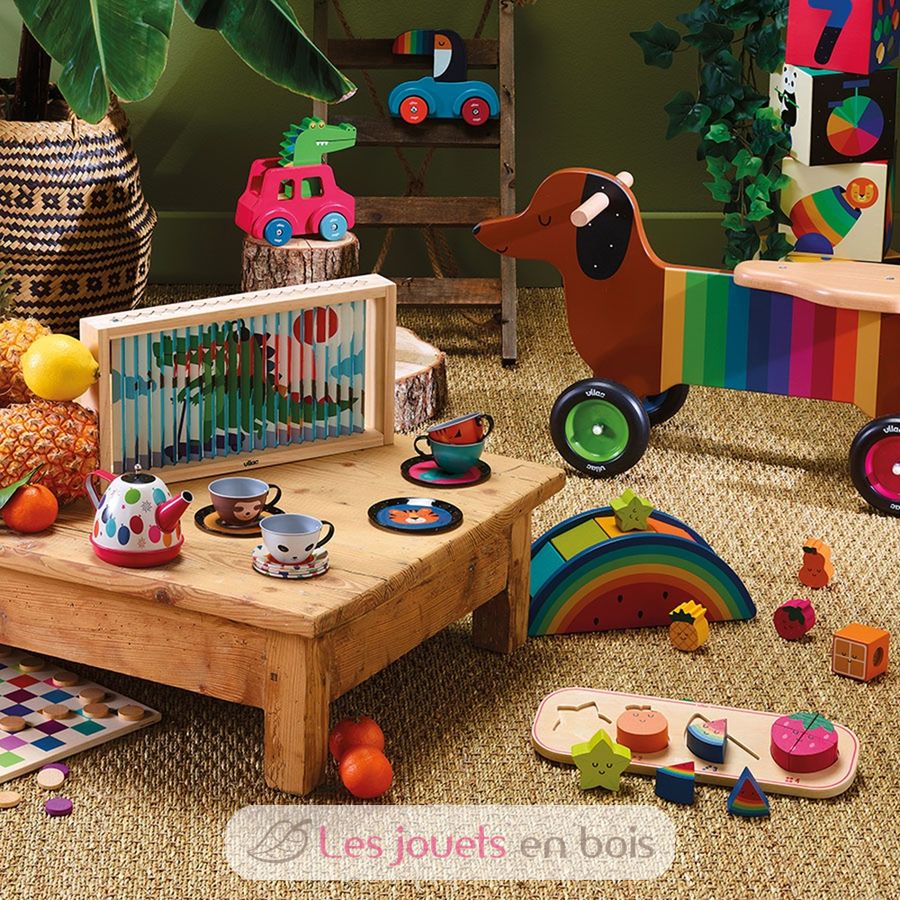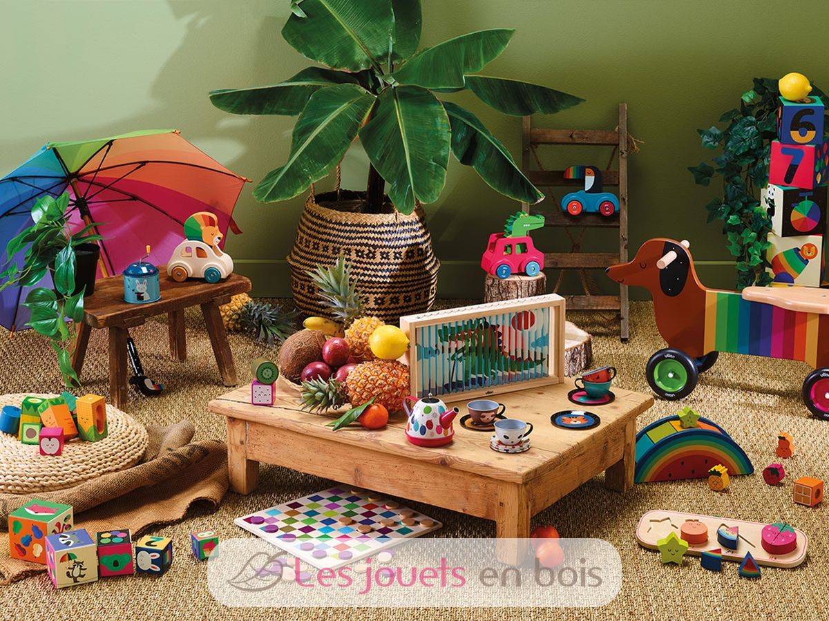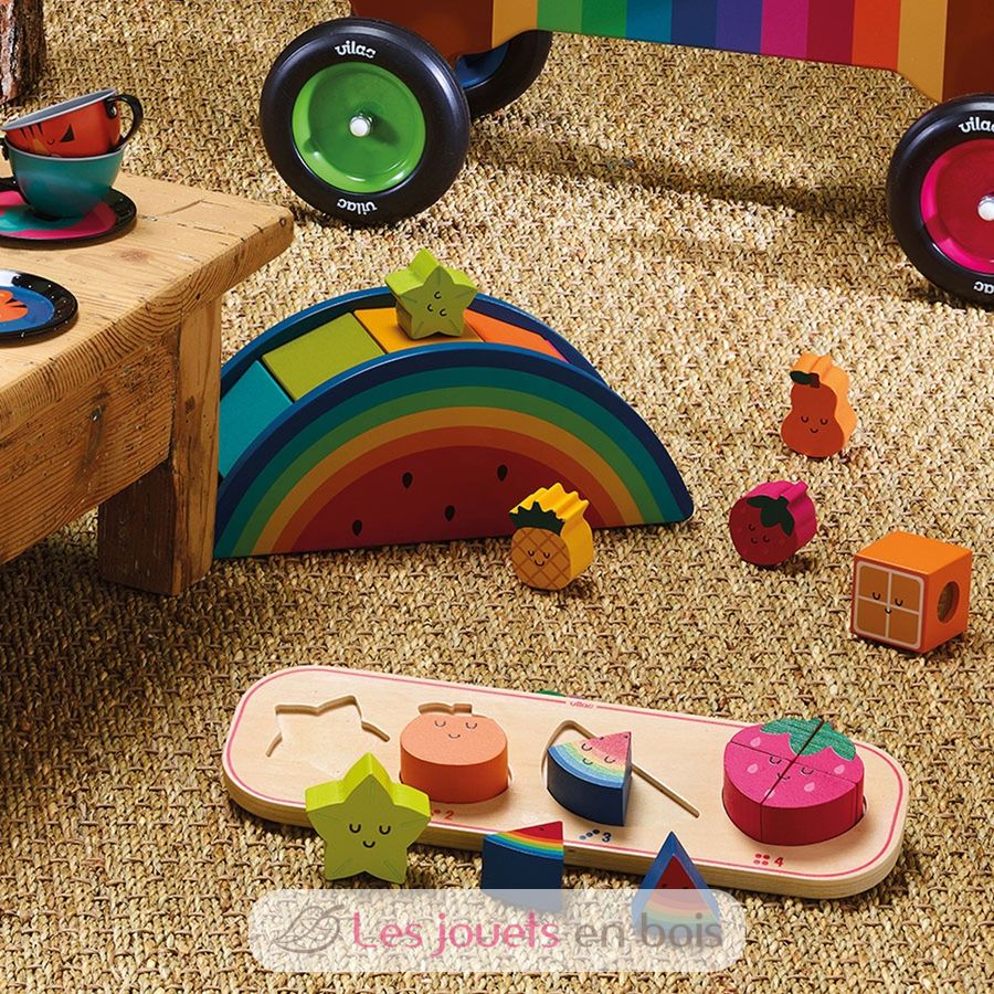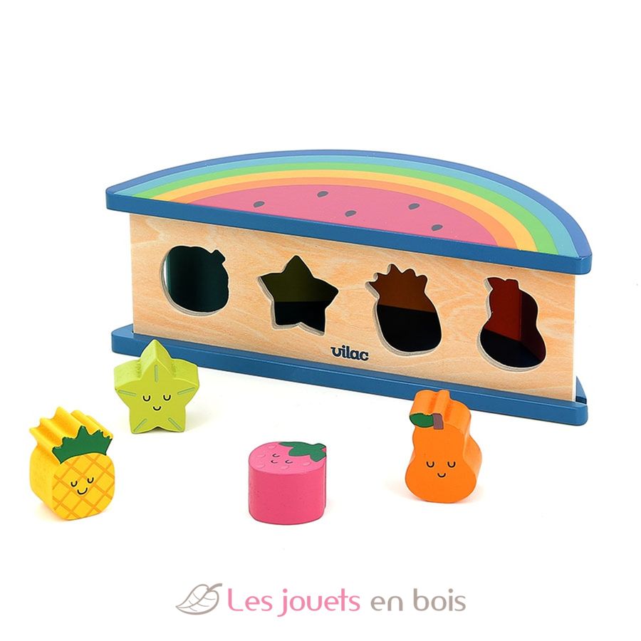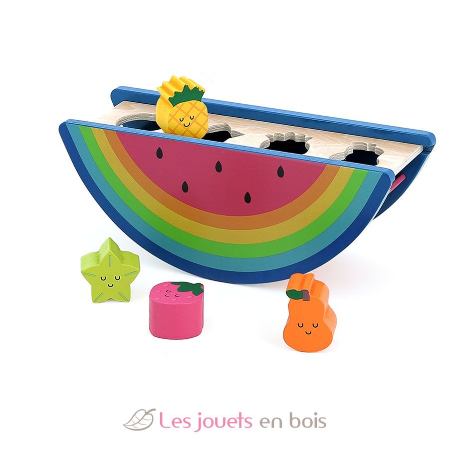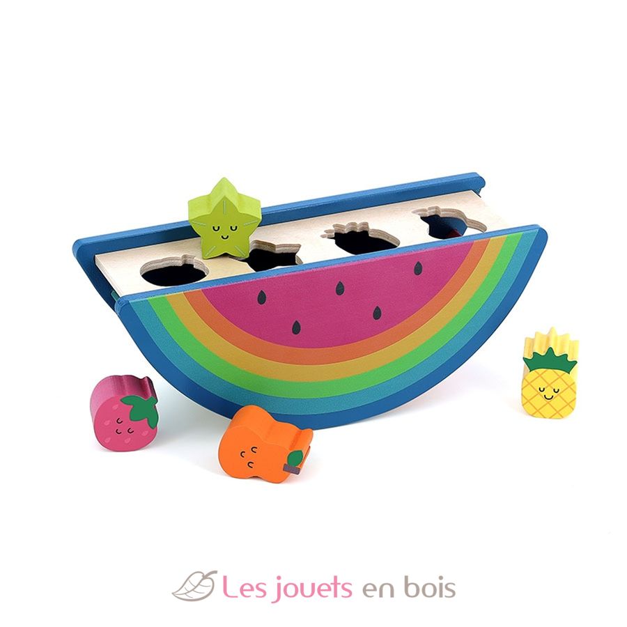 This pretty shape sorter and its 4 fruits (pear, pineapple, starfruit, and strawberry) will develop young children's observation skills, logic, and dexterity.