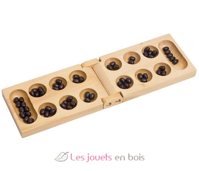 This wooden game Kalaha (also known as "Awale") is a game of tactis and concentration for 2 players with simple rules but many tactical possibilities. Easy to take everywhere! The aim of this game Kalaha, also called "seed game" is win your own and your opponent's seeds and collect them in the Kalaha pit by distributing the seeds skilfully and with foresight to the playing pits. This game contains 1 board and 72 seeds. Game of Kalaha, a wooden game of tactics made by Goki. Item number HS325.