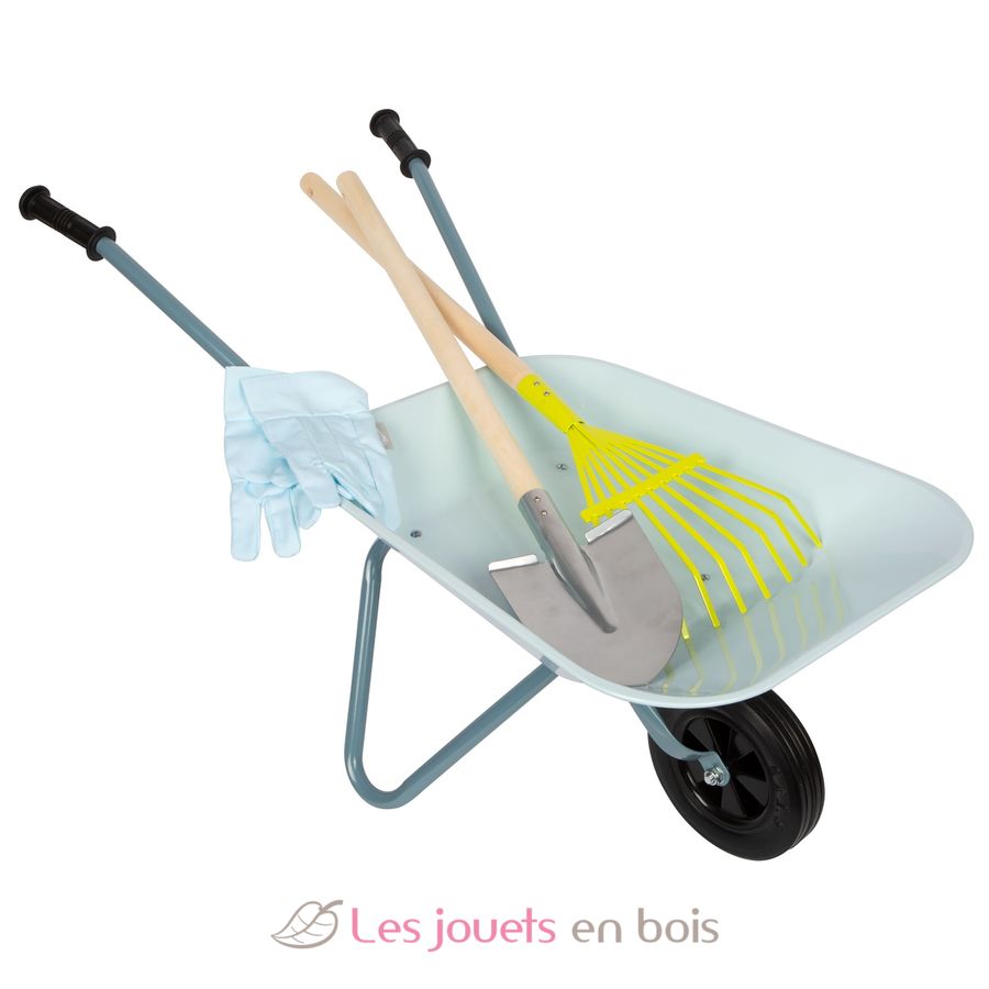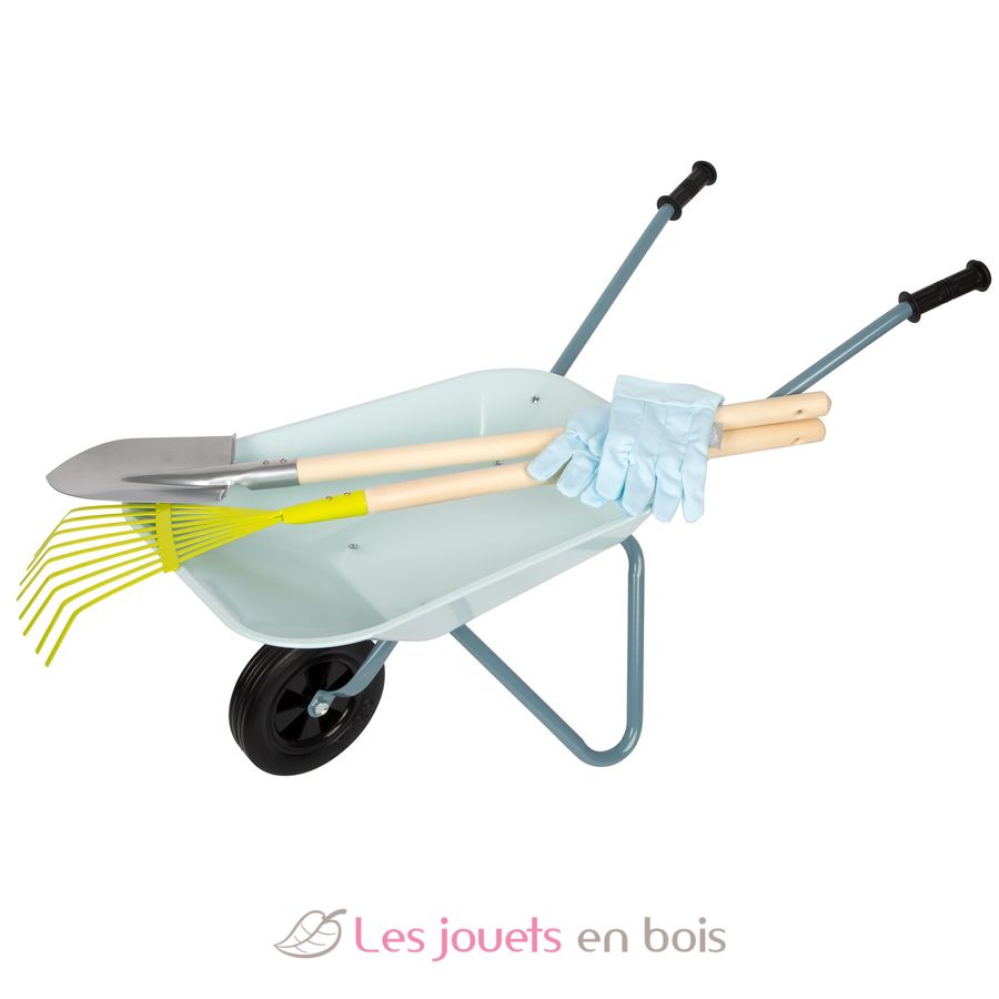 Children wiil be perfectly equipped for garden work with this garden tool set consisting of a wheelbarrow with a metal trough, gardening gloves, a spade, and a rake.